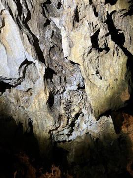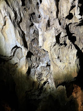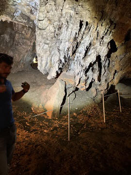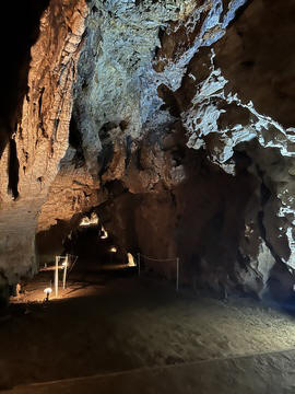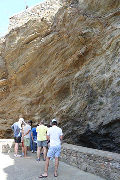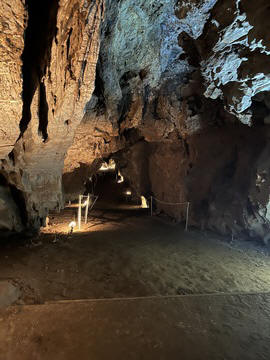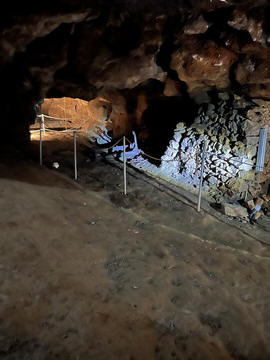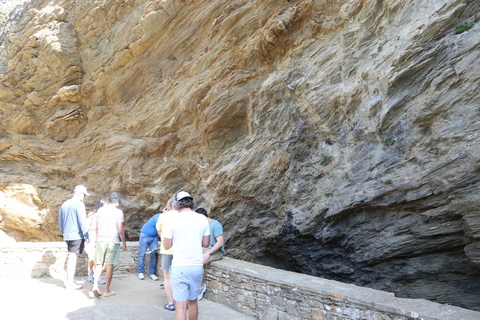 We then came to the Katafyki Cave at a high point above the village. Trough the ages, the cave has served as a refuge, food storage area (as its temperature always hovers around 17°C), a place of celebration, and a mine. It also bears the name "Giorgos Martinos Cave" in honor of the geologist who studied it. The main part of the cave is natural, of which more than 600 meters have been mapped and which holds many stalactites and stalagmites. The stalactites in the hall are of various colors and shapes and have names such as 'jellyfish', 'octopus', 'teddy bear', etc. A large stalagmite is called 'Tower of Babel'. To the right of the room are sheets of limestone and iron ore. In another area of the cave, there is a "trough" formation as water accumulates there between the stalactites and stalagmites. Over many generations, the cave has been greatly expanded with a 2000 meter-long man-made gallery, a mined area, and a mine shaft leading miles away to the ocean. Long tunnels have been formed in the cave due to the flow of water from a torrent. It is estimated that the cave's passageways cover an area of 3500 square meters in total. At the entrance there is a plateau called the 'small plateau' and further on lies the 'large plateau' or piazza. In the 'large piazza' people of Dryopida used to hold religious festivals after the Resurrection during Easter. Further to the right there are corridors, two of which lead to the 'stalactite hall', of an area of 25x17 meters, where one can find stalactites and stalagmites. The rocks of the cave are stratified vertically into shale, marble and slate. George pointed out the original entrance, which was rather small. He explained that the villagers could retreat into the cave as a sanctuary, providing a hard to find and defensible location to protect against pirate raids and attacks. Consequently, each family was allotted an area and used it to store food and other items in the cool and dry cave. The cave also provided a pace for village celebration, as all of the villagers could assemble in a couple areas. Many of the villagers were married here instead of the church, which didn't exist until much later. They have now added a new and easier to navigate entrance, while also creating better steps for a circular path and route through the cave. He also discussed the cave's use as an iron mine, dating back to antiquity, as there are references to metal mines in Kythnos in the literature. Iron mining in modern times lasted from 1835 (after the founding of the modern Greek state) to 1940, while after 1910 exploitation was carried out by foreign companies. They mined hematite as the main mineral. There were still rails leading down the shaft to the sea, operating as a funicular over the several mile distance, with one care loaded going downhill and another being pulled back up. He also showed the remains of several wagons and mining tools.