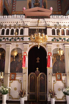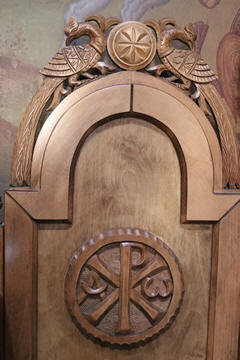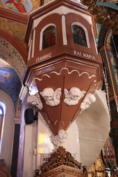 One of our first stops was at the Holy Church of the Holy Apostles, which is the central church of the Dryopida settlement rising between the beautiful traditional houses. We notes the beautiful wood carvings, again featuring images of a double-eagle. Steve asked George about this recurring image. George, quick with the answer, explained it was a traditional symbol of the Roman Empire, which was continued in Byzantine images and heraldry, representing the dual sovereignty of the emperor both in secular and religious matters and/or dominance over both East and West. It was used in the Byzantine Empire's flag until its dying days in 1453, then it was adopted for use by the Greek Orthodox Church in its flag and key motifs as a way of continuing the Roman or Catholic Church in the east which became the Greek Orthodox with the split of popes along with emperors between Rome and Constantinople.