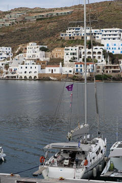 The crossing took us across part of the Aegean Sea to the Cyclades Islands. The name Cyclades "(Κυκλάδες νήσοι, Kykládes nísoi, 'encircling islands') refers to the archipelago forming a circle (or cycle) around the sacred island of Delos (close to Myconos). The largest island of the Cyclades is Naxos, however the most populated is Syros. The islands have been inhabited since before the Late Neolithic and Early Bronze Age, with evidence of early copper workings. A distinctive Neolithic culture amalgamating Anatolian and mainland Greek elements arose in the western Aegean before 4000 BCE. Each of the small Cycladic islands could support no more than a few thousand people, though Late Cycladic boat models show that fifty oarsmen could be assembled from the scattered communities, and when the highly organized palace-culture of Crete arose, the islands faded into insignificance, with the exception of Delos (revered as the birthplace of Apollo and Artemis, acted as the center and meeting place of the early Athenian League, and is one of the most important mythological, historical, and archaeological sites in Greece), which retained its archaic reputation as a sanctuary throughout antiquity and until the emergence of Christianity. The Cyclades includes about 220 islands. Ermoupoli on Syros is the chief town and administrative center of the former prefecture. The islands are peaks of a submerged mountainous terrain, with the exception of two volcanic islands, Milos and Santorini. The climate is generally dry and mild, but with the exception of Naxos, the soil is not very fertile; agricultural produce includes wine, fruit, wheat, olive oil, and tobacco.