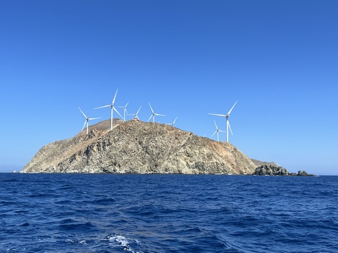 About halfway across we passed close by the uninhabited island of Agios Georgios (St George), which is essentially a barren rock with a large number of windmills for power. The 23 windmills provide power to the mainland via an undersea cable.