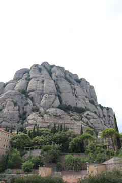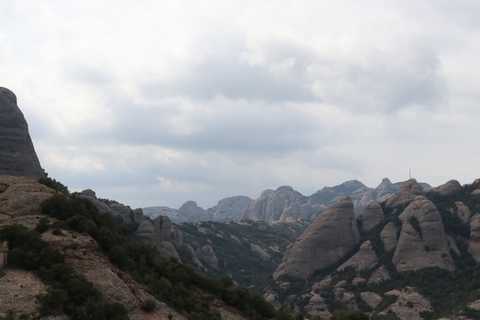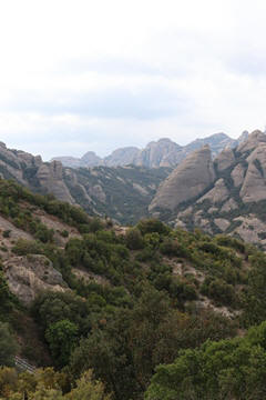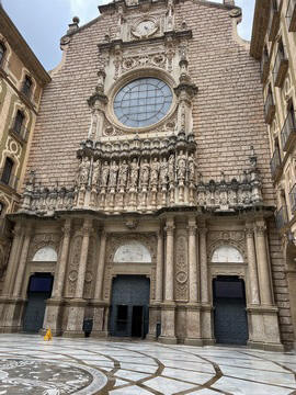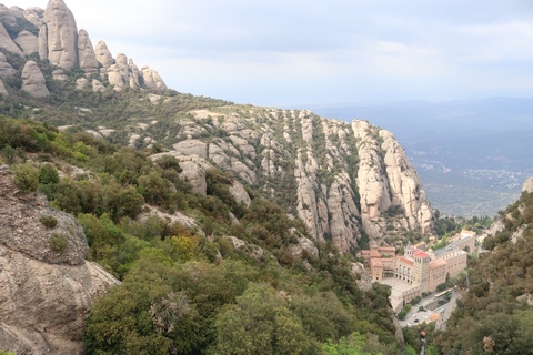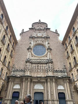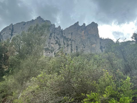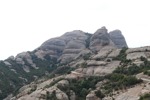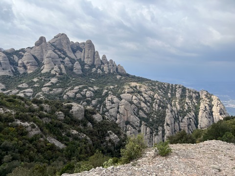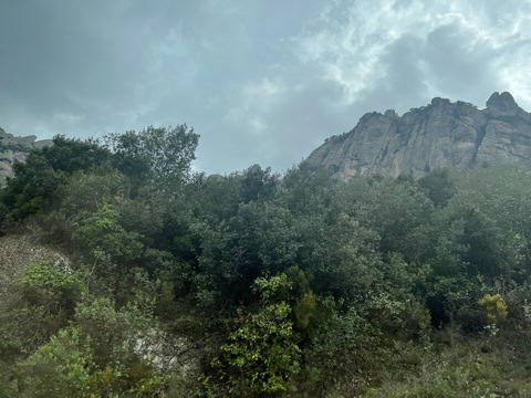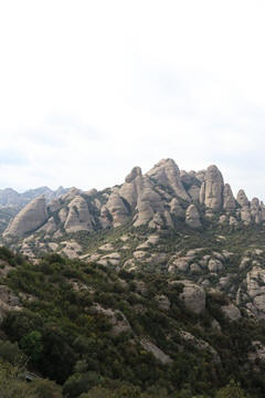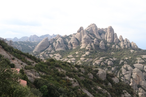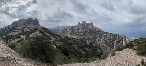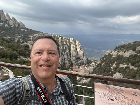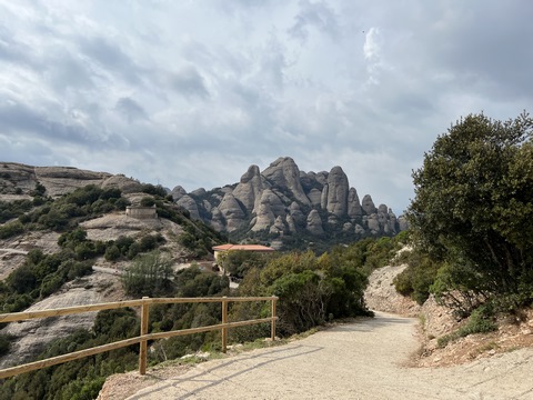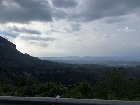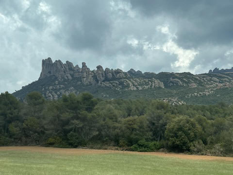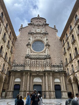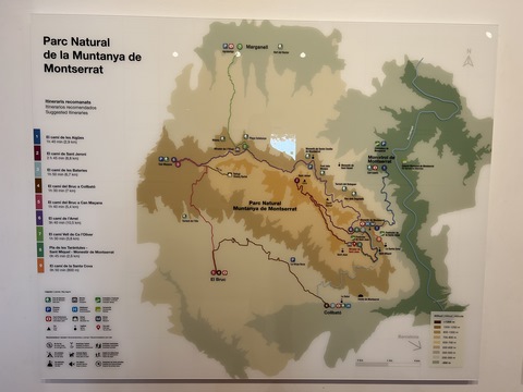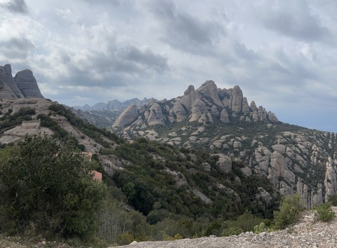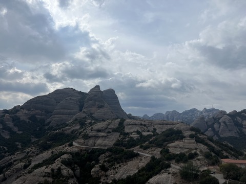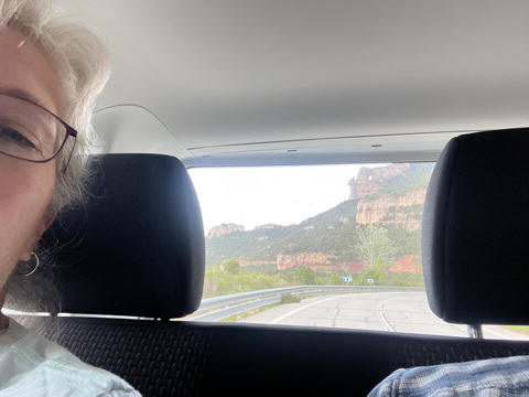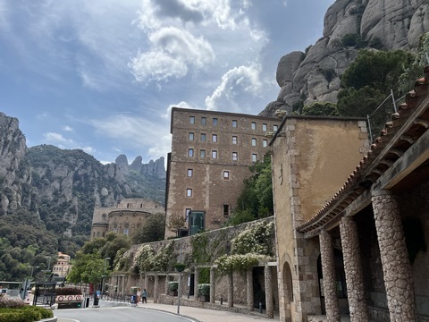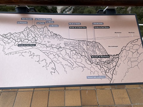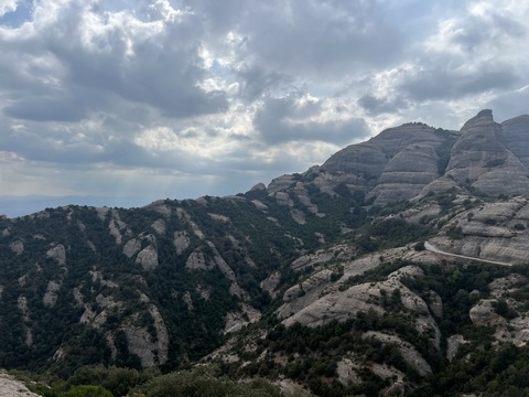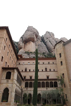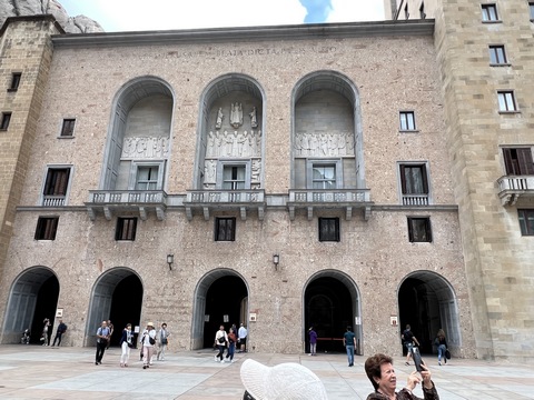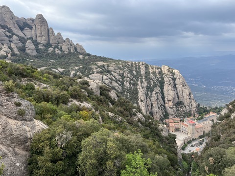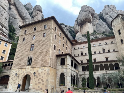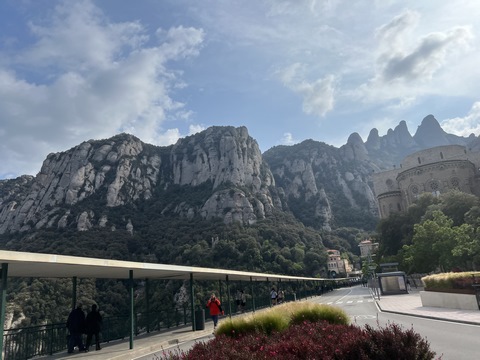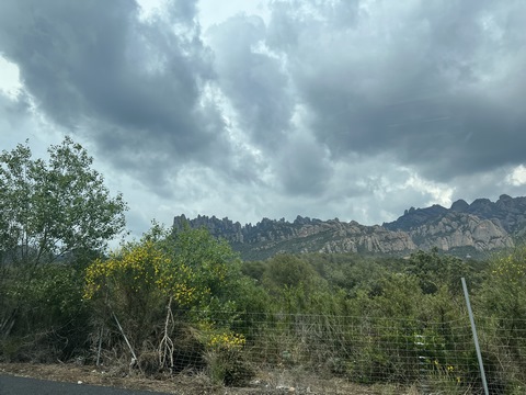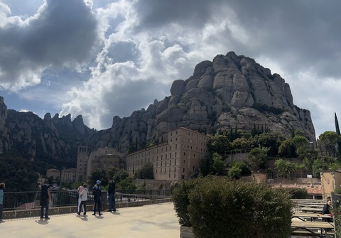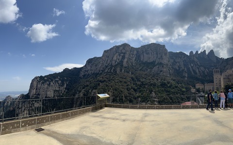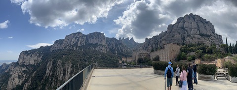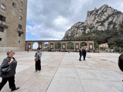 May 2023 (Part 18) Greece/Spain Trip - Day 11, May 23 (Part Two) - Montserrat and Barcelona, Spain After lunch, we loaded up and Pablo headed us out of town to Montserrat. It was a reasonably short trip (under an hour), but some of us still managed to take a short nap as we were a bit groggy after lunch. Once we got into the mountains, it was impossible not to be fascinated by the scenery. As Pablo explained, Montserrat is a multi-peaked mountain range which is part of the Catalan Pre-Coastal Range. The area is named for the serrated impression of the range, looking almost like a toothed saw. The mountain is composed of strikingly pink conglomerate, a form of sedimentary rock. Montserrat was designated as a National Park in 1987.