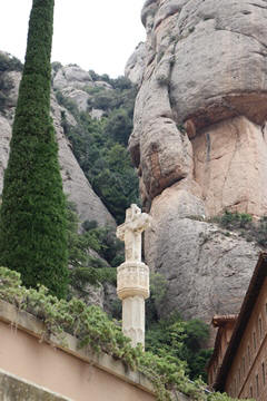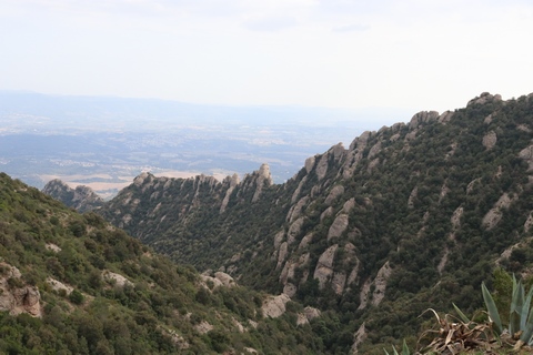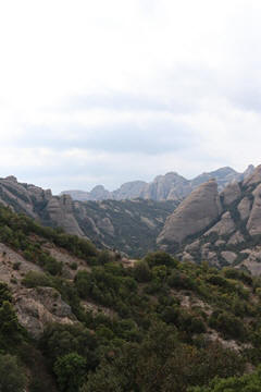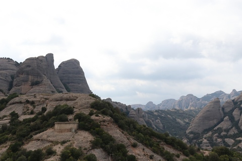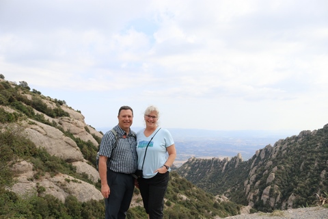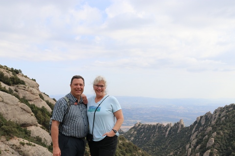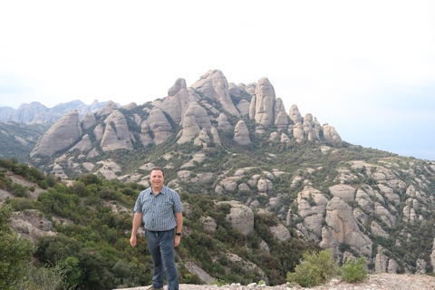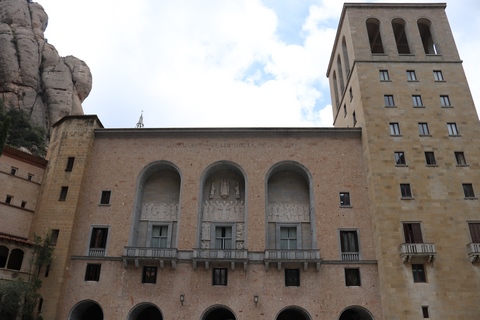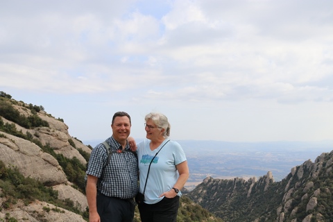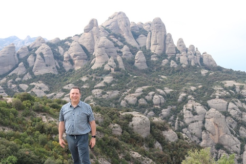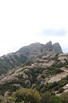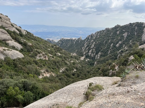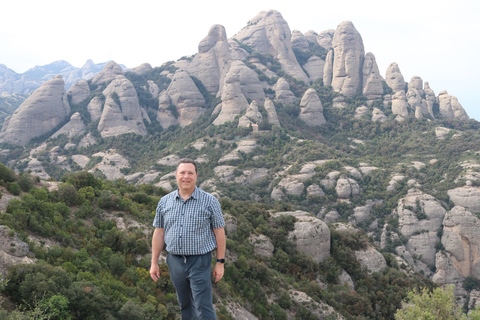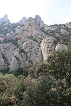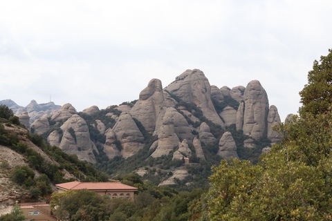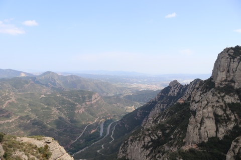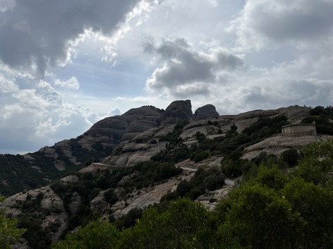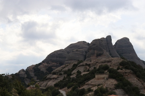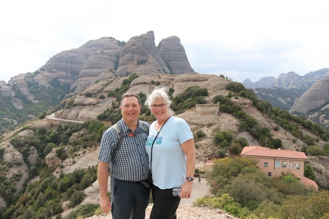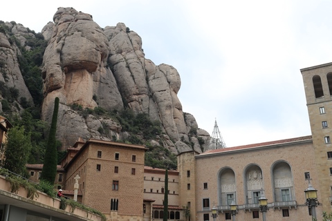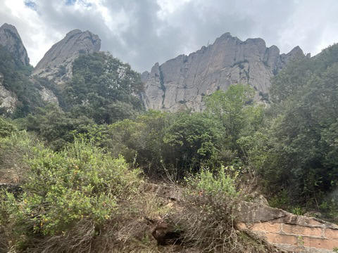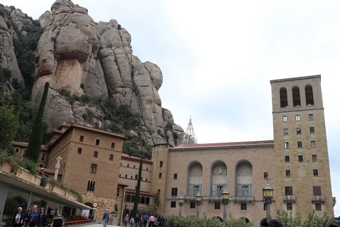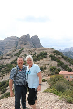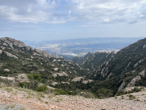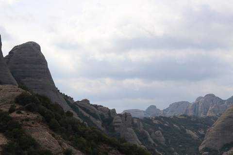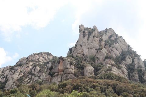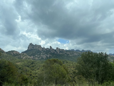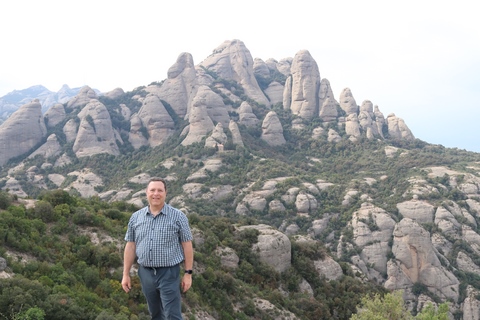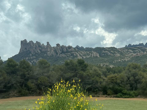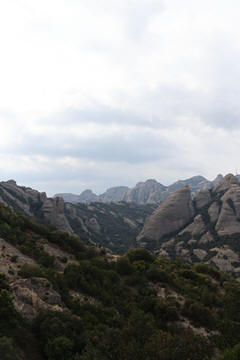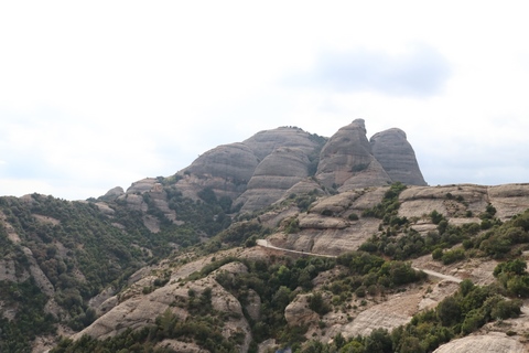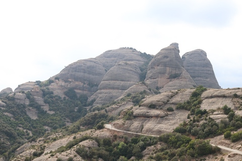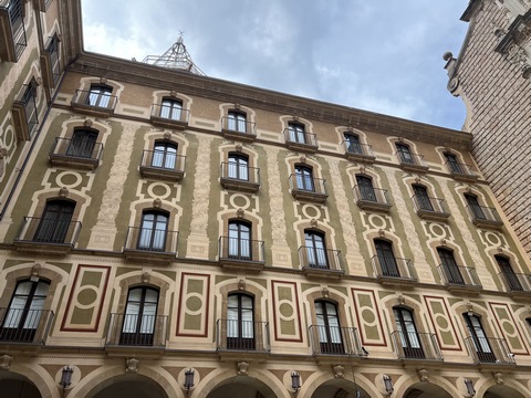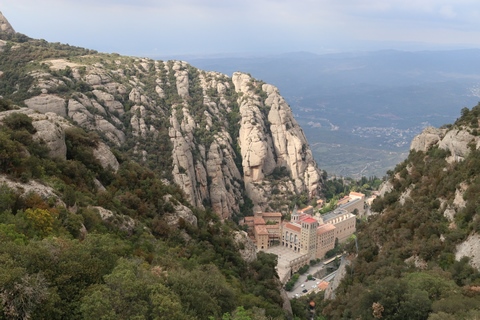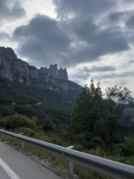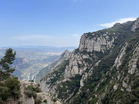 May 2023 (Part 18) Greece/Spain Trip - Day 11, May 23 (Part Two) - Montserrat and Barcelona, Spain After lunch, we loaded up and Pablo headed us out of town to Montserrat. It was a reasonably short trip (under an hour), but some of us still managed to take a short nap as we were a bit groggy after lunch. Once we got into the mountains, it was impossible not to be fascinated by the scenery. As Pablo explained, Montserrat is a multi-peaked mountain range which is part of the Catalan Pre-Coastal Range. The area is named for the serrated impression of the range, looking almost like a toothed saw. The mountain is composed of strikingly pink conglomerate, a form of sedimentary rock. Montserrat was designated as a National Park in 1987.