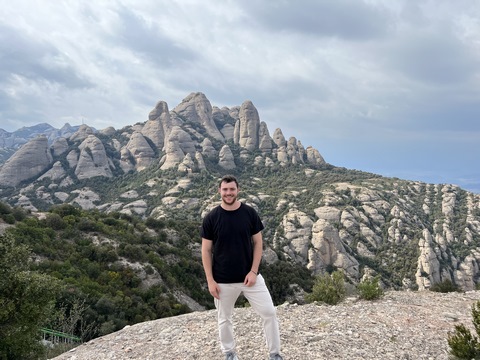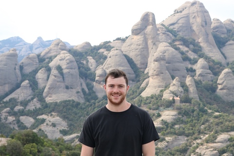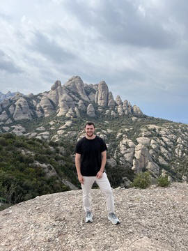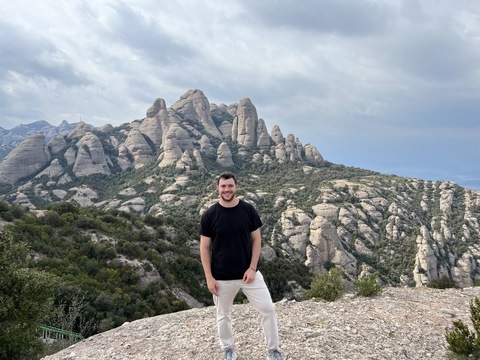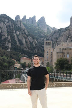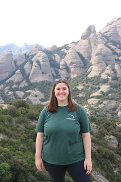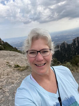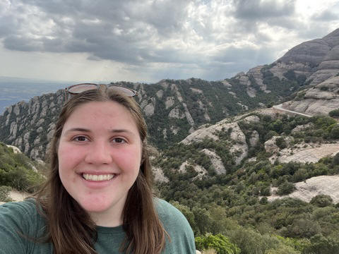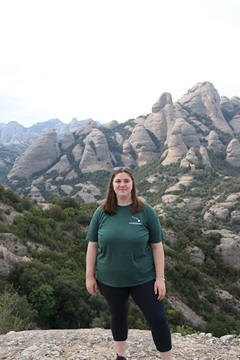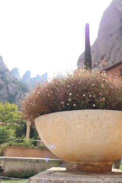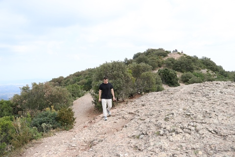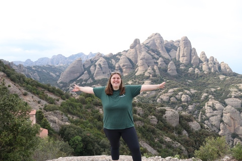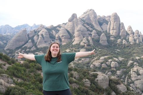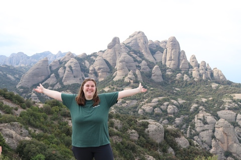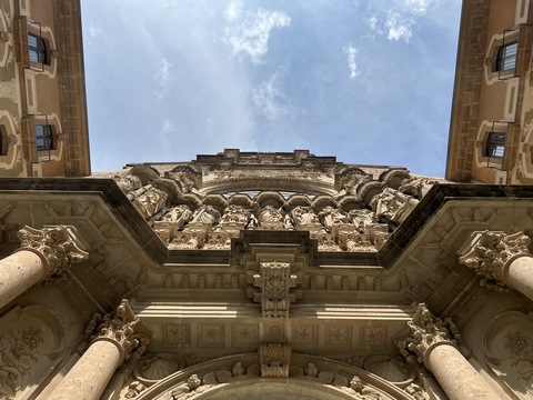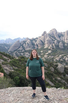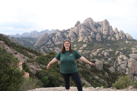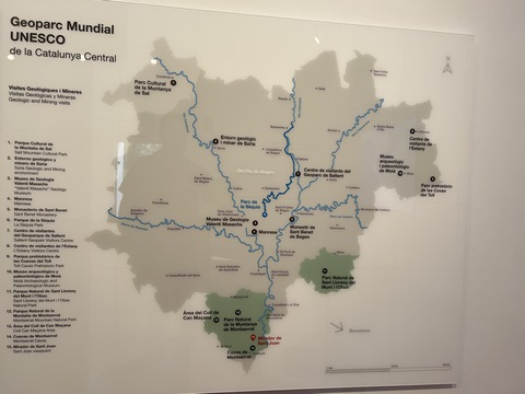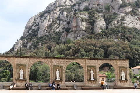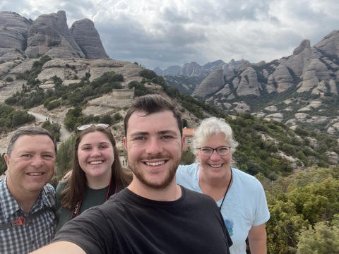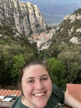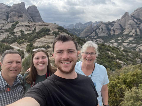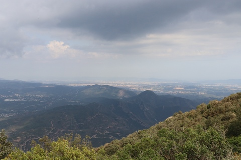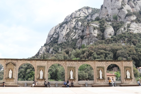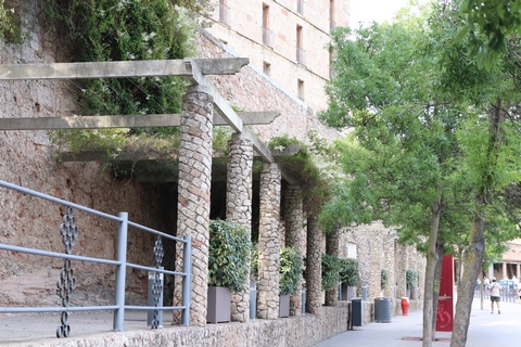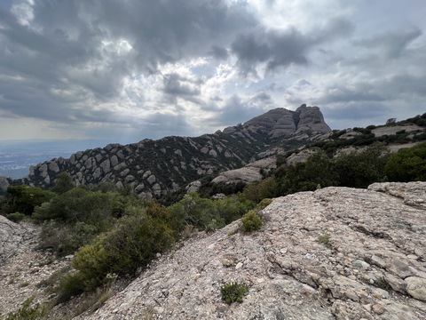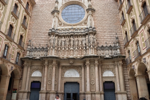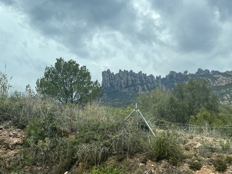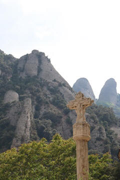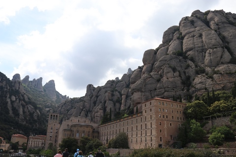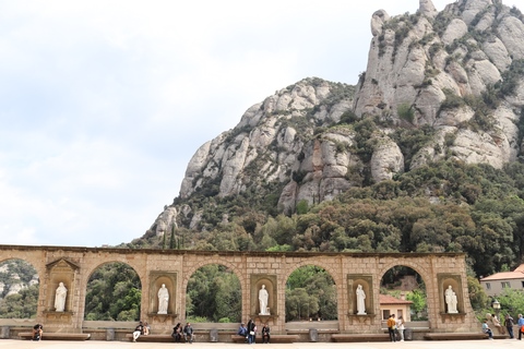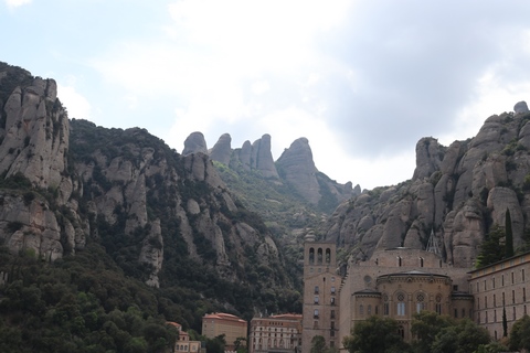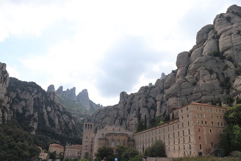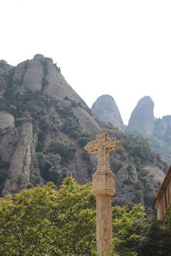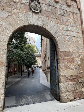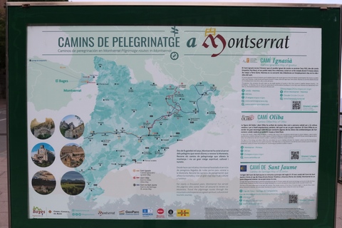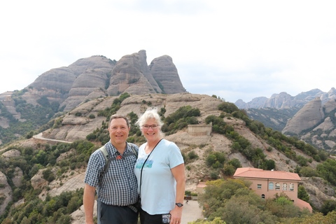 May 2023 (Part 18) Greece/Spain Trip - Day 11, May 23 (Part Two) - Montserrat and Barcelona, Spain After lunch, we loaded up and Pablo headed us out of town to Montserrat. It was a reasonably short trip (under an hour), but some of us still managed to take a short nap as we were a bit groggy after lunch. Once we got into the mountains, it was impossible not to be fascinated by the scenery. As Pablo explained, Montserrat is a multi-peaked mountain range which is part of the Catalan Pre-Coastal Range. The area is named for the serrated impression of the range, looking almost like a toothed saw. The mountain is composed of strikingly pink conglomerate, a form of sedimentary rock. Montserrat was designated as a National Park in 1987.