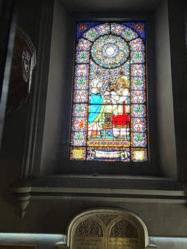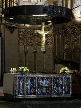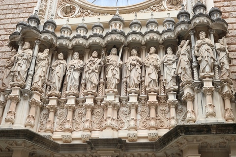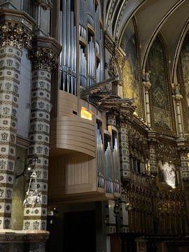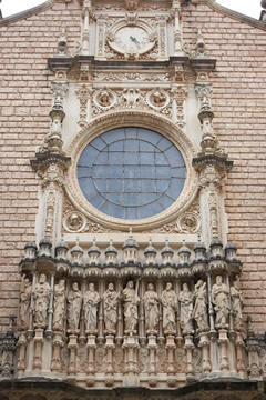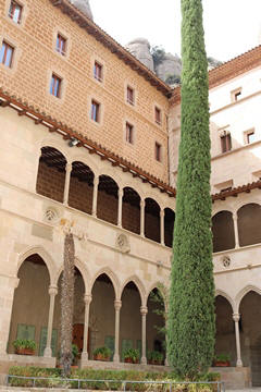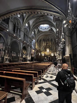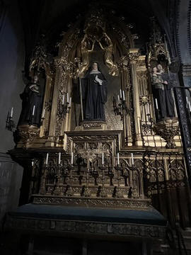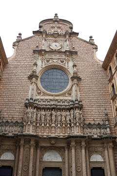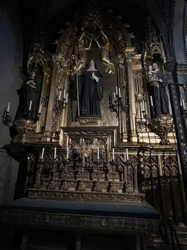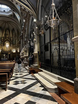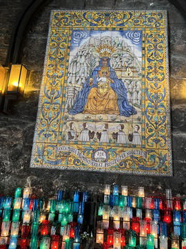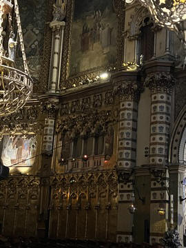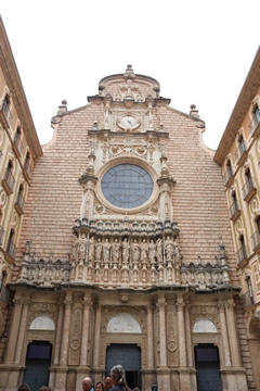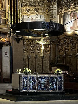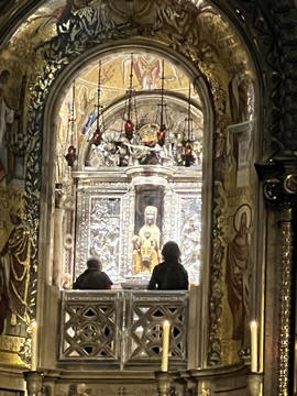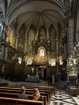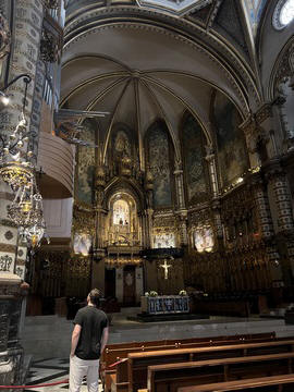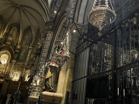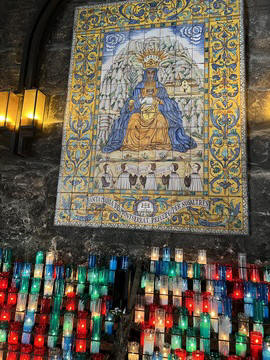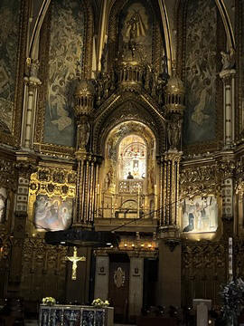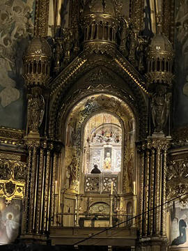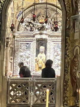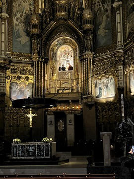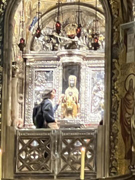 The church was built to house Our Lady of Montserrat or the Virgin of Montserrat (Catalan: Mare de Déu de Montserrat), the Marian title associated with a statue of the Madonna and Child. She is the Patron Saint of Catalonia, an honor she shares with Saint George (Sant Jordi in Catalan). Miracles have been attributed to the statue. Pope Leo XIII granted the image a Canonical coronation on 11 September 1881. The image is one of the Black Madonnas of Europe, hence its familiar Catalan name, La Moreneta ("the little dark-skinned one" or "the little dark one"). Believed by some to have been carved in Jerusalem in the early days of the Church (and potentially brought to the mountain by Crusaders), it is more likely a Romanesque sculpture in wood from the late 12th century The legend places the finding of the statue of the Virgin of Montserrat around 880, while the origin of the monastery is uncertain, records of it date back to 1100. By one account, the image of the Madonna was moved to Montserrat in 718, to avoid the danger posed by invading Saracens. Legend has it that the Benedictine monks could not move the statue to construct their monastery, choosing to instead build around it. The statue's sanctuary is located at the rear of the chapel, where an altar of gold surrounds the icon, and is now a site of pilgrimage. The Throne of the Virgin is embossed silver. The statue itself is 95-cm (38-inch) tall and shows evidence of Byzantine conventional and stylized form. It is painted in polychrome. The body is thin and the face is elongated. She holds an orb of the earth in her right hand. The Child's hand is raised in a formalized and traditional Eastern blessing. In 2001, renovators working for the government observed that the black hands and face of La Moreneta had over the centuries undergone a change in color. They attribute the change—from a lighter tone to black—either to prolonged exposure to candle smoke or a chemical reaction caused by a varnish used as a paint sealant. The statue was repainted black by successive generations of restorers. A series of tests, including X-rays, revealed the statue's original color and also showed that the last repainting took place at the turn of the 18th century. As we didn't visit the shrine, here are two images from the web.
