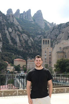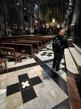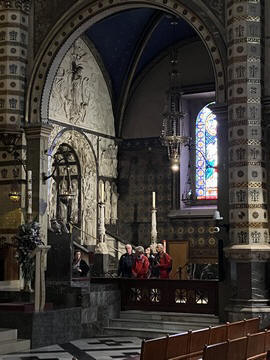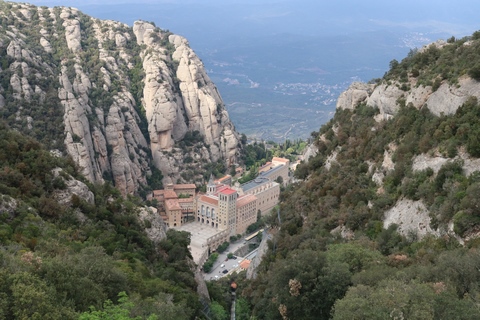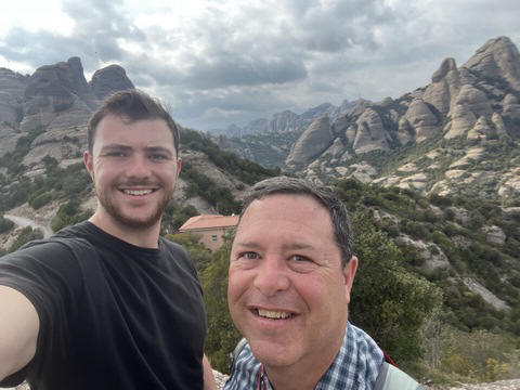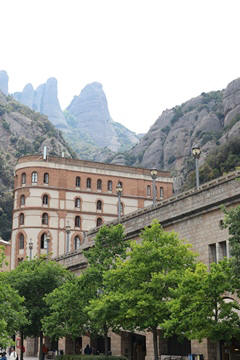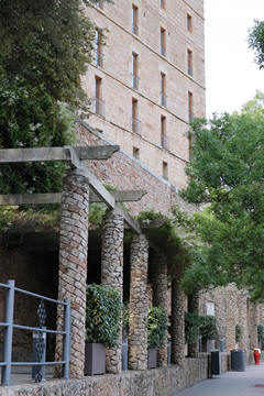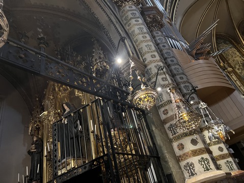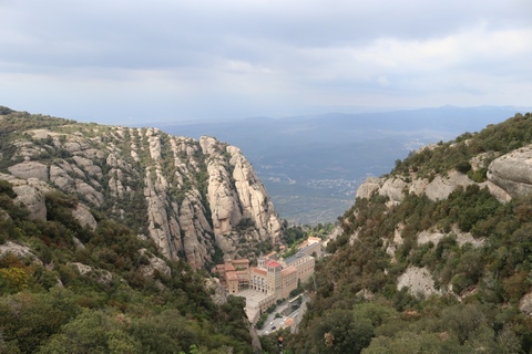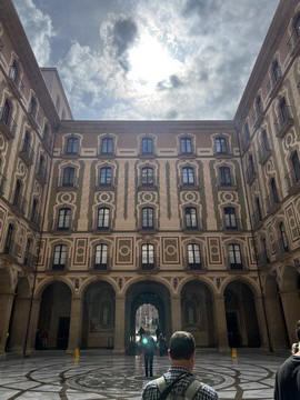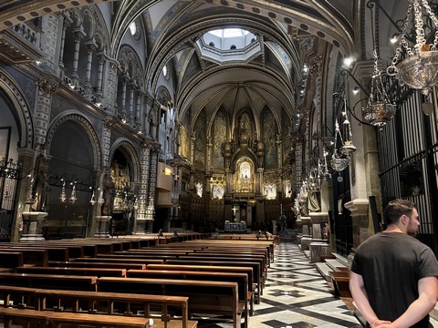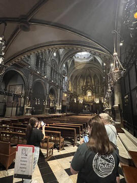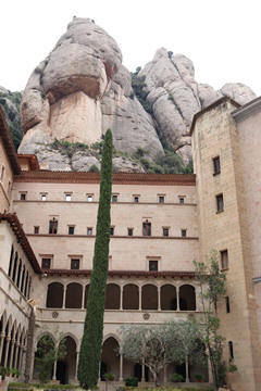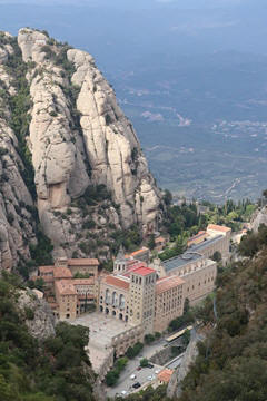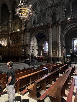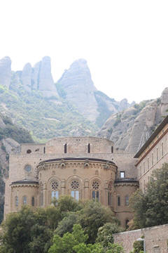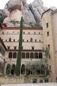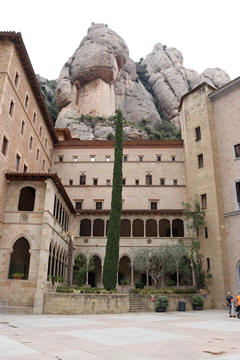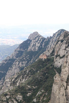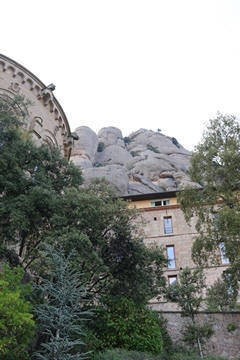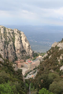 Our destination was the the Benedictine abbey of Santa Maria de Montserrat, which hosts the Virgin of Montserrat sanctuary, also known as La Moreneta ("the little tan/dark one" in Catalan). The monastery was founded in the 11th century and rebuilt between the 19th and 20th centuries, and still functions to this day with over 70 monks. There have always been roughly 80 monks in residence. Initial construction of the basilica of Montserrat began in the 16th century, and its complete reconstruction began in the year 1811, after being burned down and sacked twice by Napoleon's troops in the Peninsular War when many of its treasures were lost. It was restored by 1844. In 1880, Montserrat celebrated 1000 years of existence. On 11 September 1881 to coincide with the Catalan national day, Pope Leo XIII proclaimed the Virgin of Montserrat patron of Catalonia. The mountain of Montserrat has been of religious significance since pre-Christian times, when the Romans built a temple to honor the Roman goddess Venus. It is Catalonia's most important religious retreat and groups of young people from Barcelona and all over Catalonia make overnight hikes here at least once in their lives to watch the sunrise from the heights of Montserrat. The Virgin of Montserrat is Catalonia's favorite saint, and is located in the sanctuary of the Mare de Déu de Montserrat, next to the Benedictine monastery nestling in the towers and crags of the mountain. The Escolania, Montserrat's Boys’ Choir, is one of the oldest in Europe, and performs during religious ceremonies and communal prayers in the basilica. They provide a short concert every day, but we arrive too late in the day. Once there, Steve and Andy ran up to an observation deck to get a better view, then caught up with the group. The monastery is nestled into an amazing valley up against the mountain.