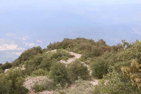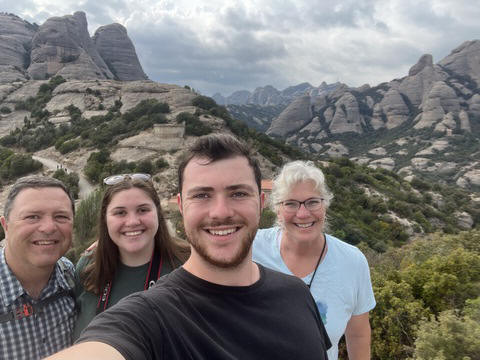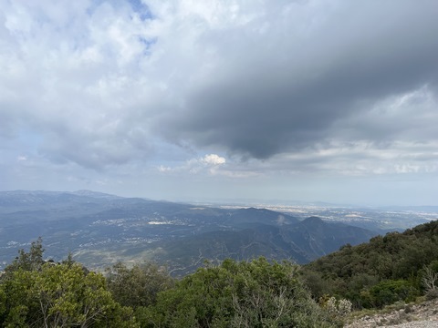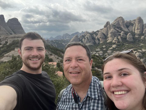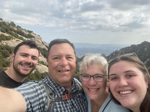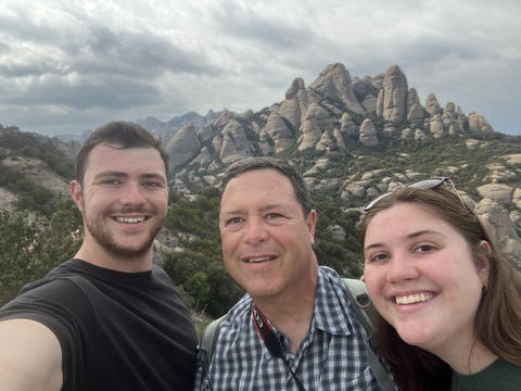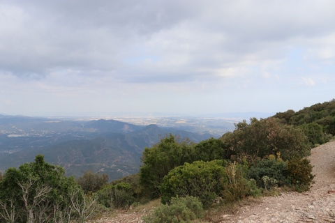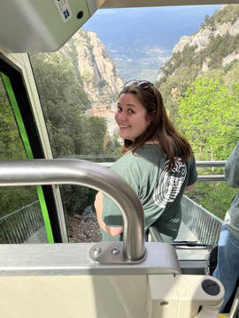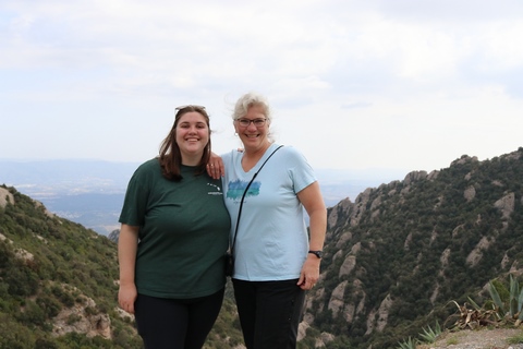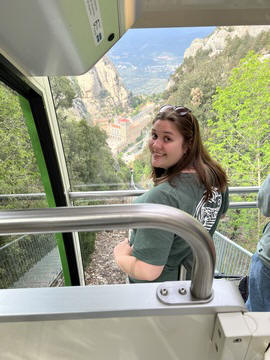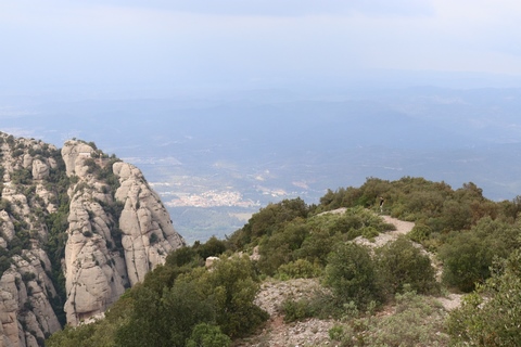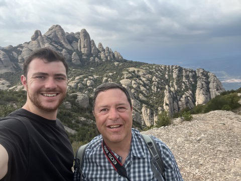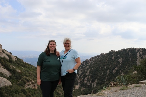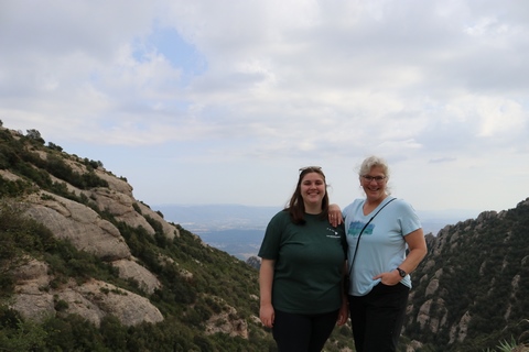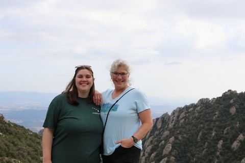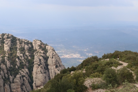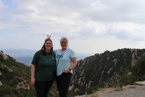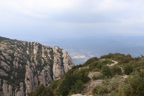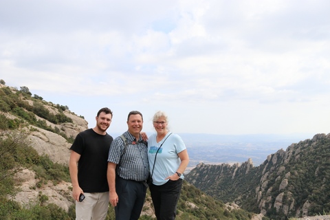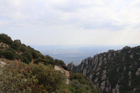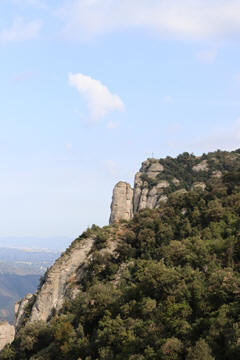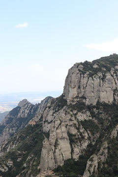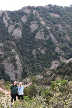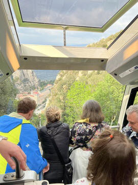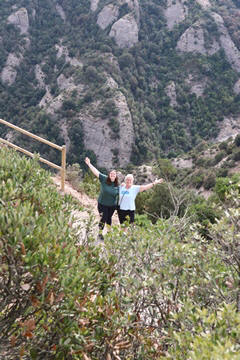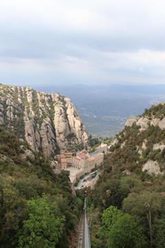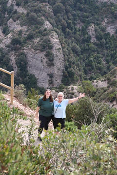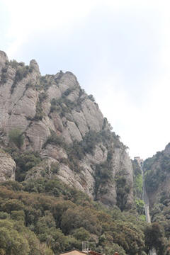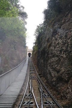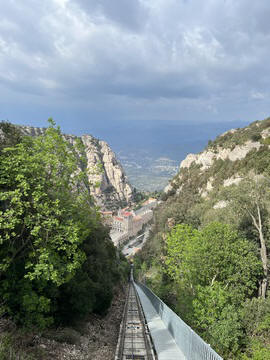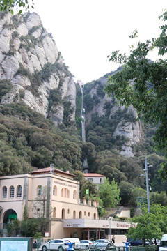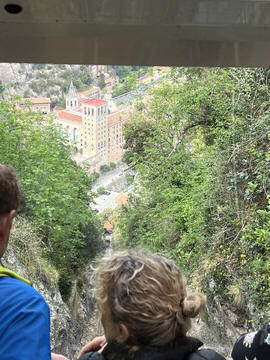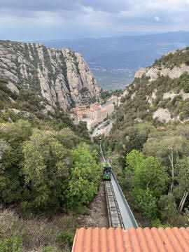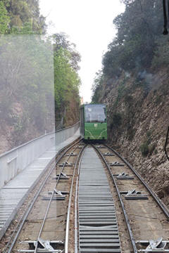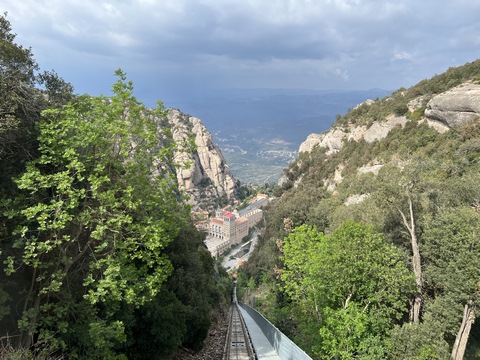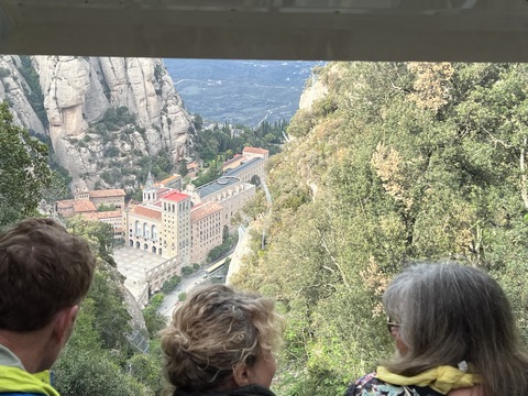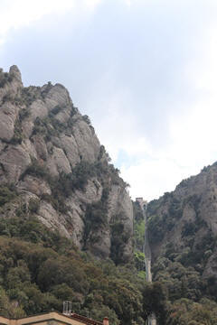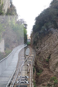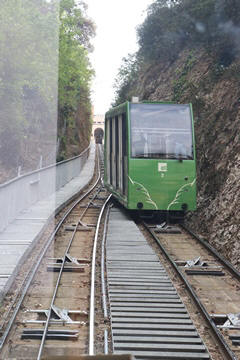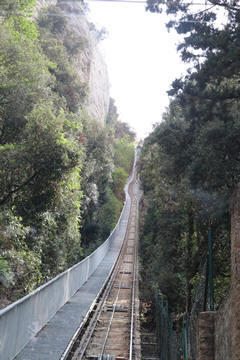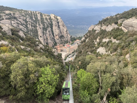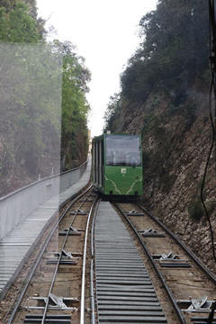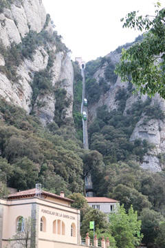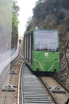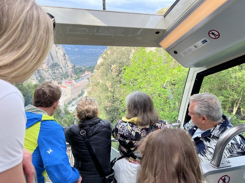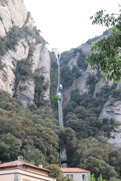 There are two funiculars, one connecting with Santa Cova (a shrine and chapel lower down the mountain) and the other connecting with the upper slopes of the mountain. We had all voted to ride the Funicular de Sant Joan (Saint Joan Funicular) to the top of the mountain. At 1,236 meters (4,055 ft) above the valley floor, Montserrat is the highest point of the Catalan lowlands, and stands central to the most populated part of Catalonia. Montserrat's highest point, Sant Jeroni, can be reached by footpaths leading from the monastery. From Sant Jeroni, almost all of Catalonia can be seen, and on a clear day the island of Mallorca is visible. Andy and Steve got into the top compartment and watched the uphill journey, while Nancy and Lexi were in the bottom compartment. We all had fun watching the other car come down, while we ascended, providing a counter-weight. When the two cars meet, the track splits apart a bit to allow them to pass.