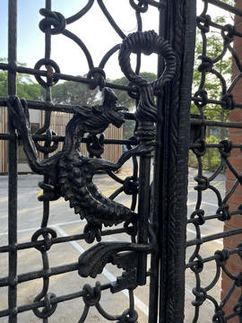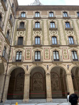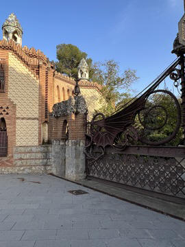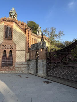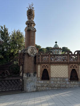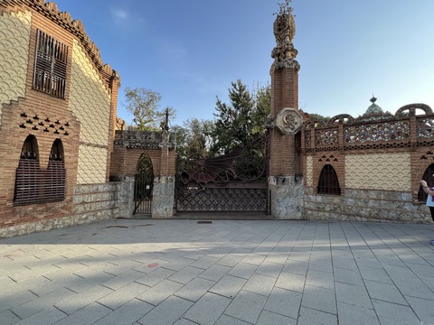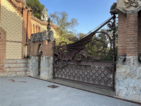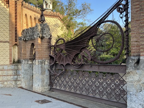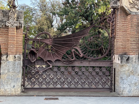 Once back in Barcelona, we decided to set out on foot from our hotel. Across the street was the Güell Pavilions, the ruins of a grand complex built in the late 1880s for Count Güell, with an elaborate gate & gardens. The gate was designed by Gaudi. We had passed this several times and decided we needed to visit for a closer view. Unfortunately the grounds were already closed for the day.