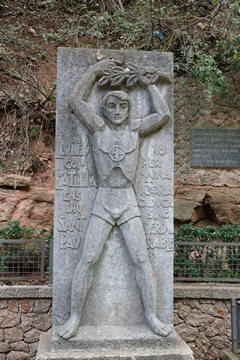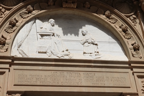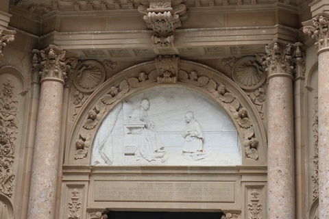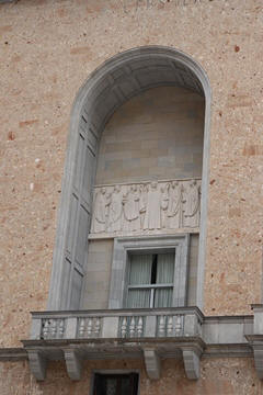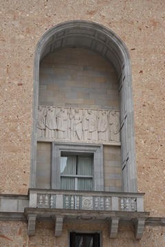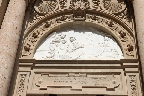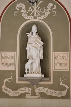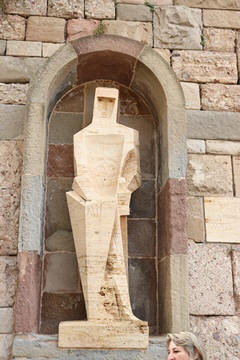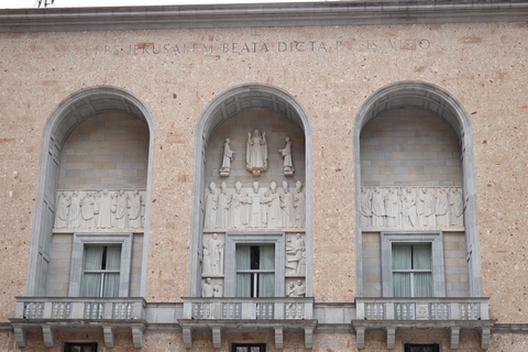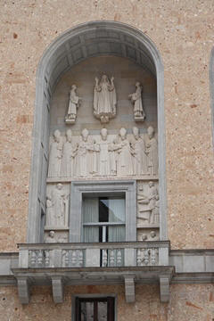 After the Spanish Civil War, a new external façade of the church was built (between 1942 and 1968), the work of Francesc Folguera i Grassi and decorated with sculptural reliefs of Joan Rebull (St. Benedict, Proclamation of the dogma of the Assumption of Mary by Pius XII and St. George, with a representation of the monks who died during the Spanish Civil War), as well as the inscription Urbs Jerusalem Beata Dicta Pacis Visio ("Blessed city of Jerusalem, called the vision of peace"). At the foot of the frieze with the relief of St. George is sculpted the phrase "Catalonia will be Christian or it will not be", attributed to the bishop Josep Torras i Bages, which has been assumed as a political motto of Catholic root.
