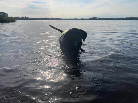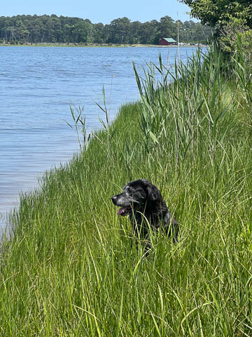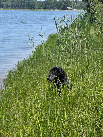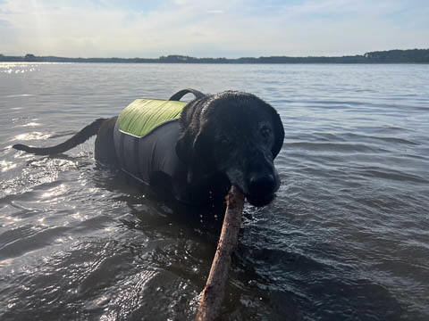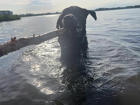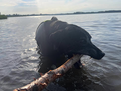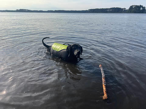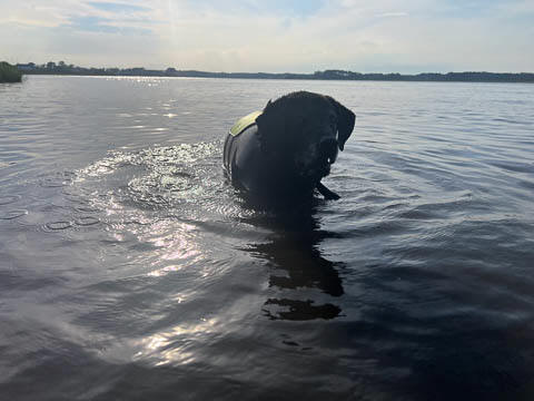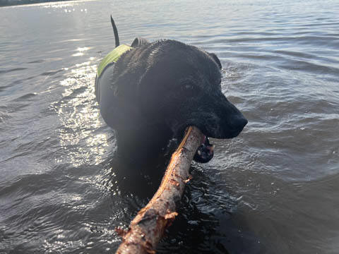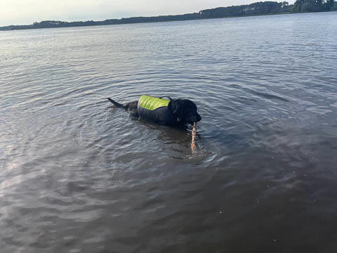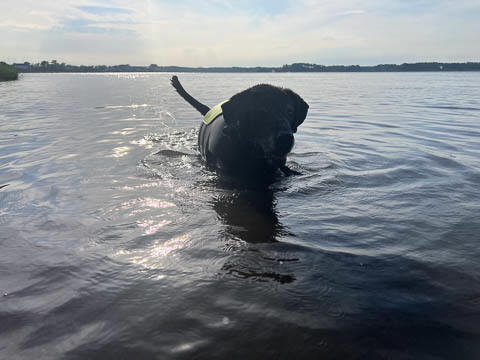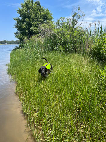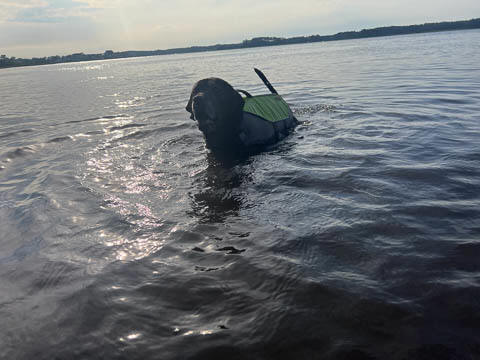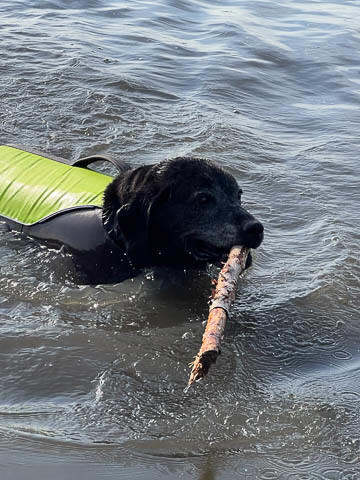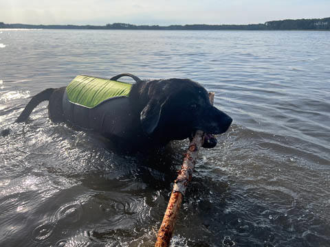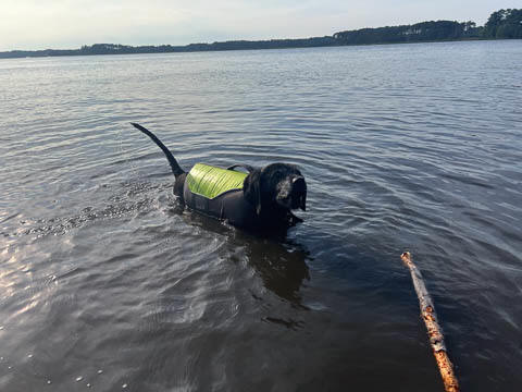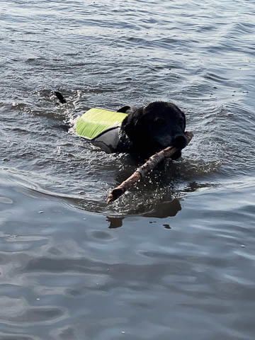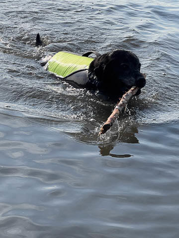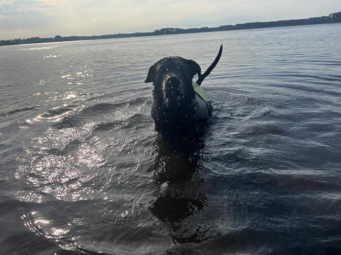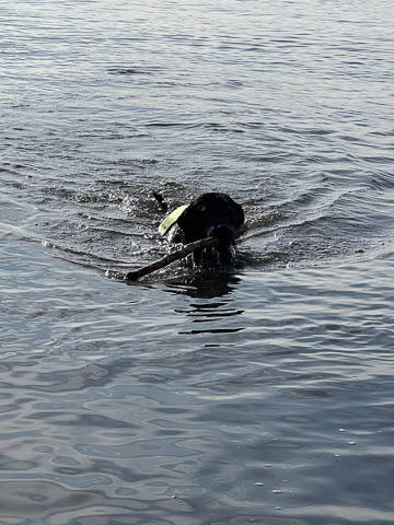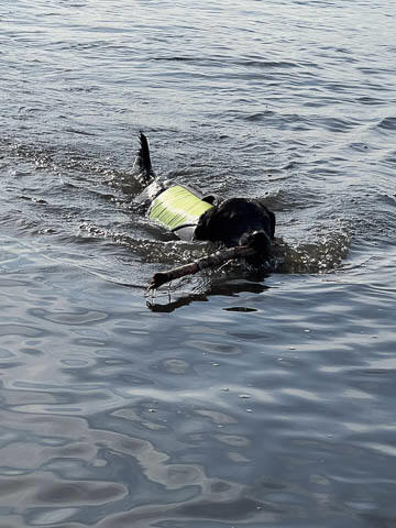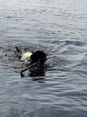 Tank really, really enjoyed going for several swims. So glad we brought sticks from home as there were none to find at the point where he goes swimming. Unfortunately, the first swimming session was near sunset, so there was a lot of glare with the sun pretty low behind Tank. He was sure happy to be on his way there.