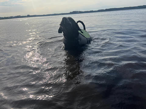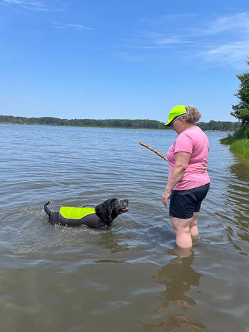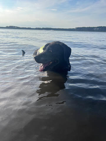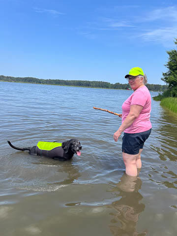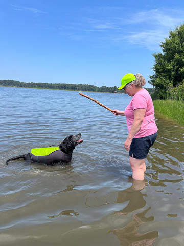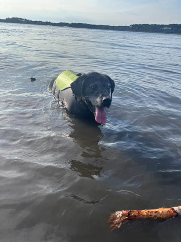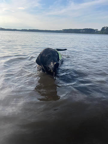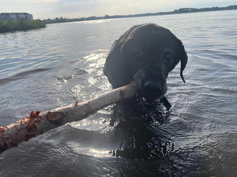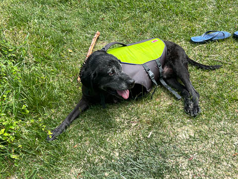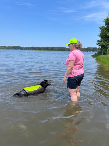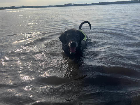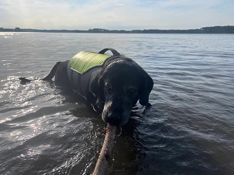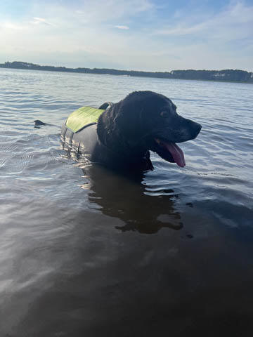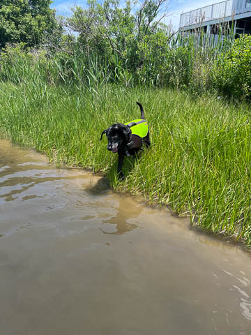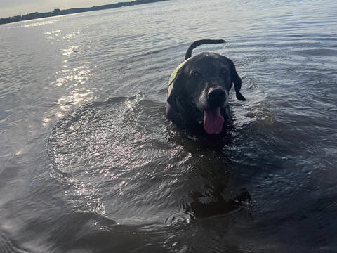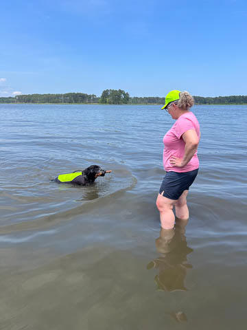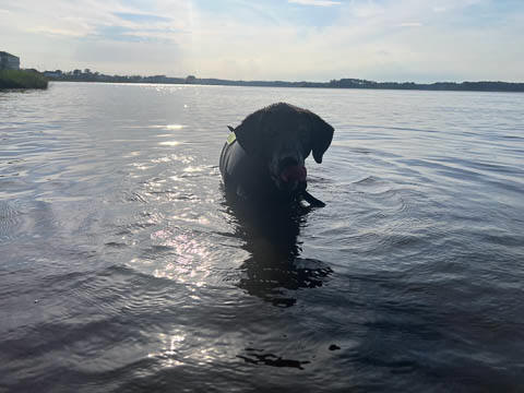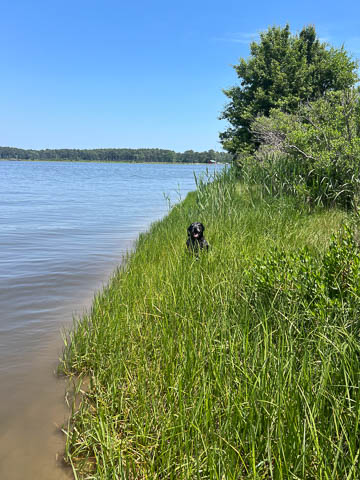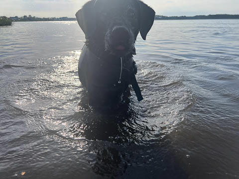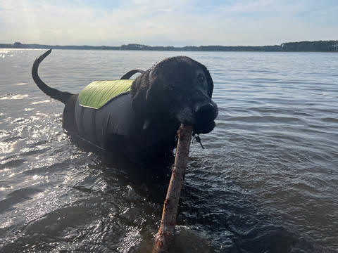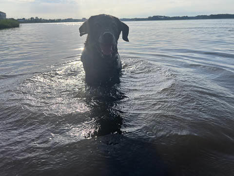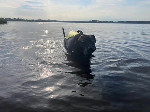 Tank really, really enjoyed going for several swims. So glad we brought sticks from home as there were none to find at the point where he goes swimming. Unfortunately, the first swimming session was near sunset, so there was a lot of glare with the sun pretty low behind Tank. He was sure happy to be on his way there.