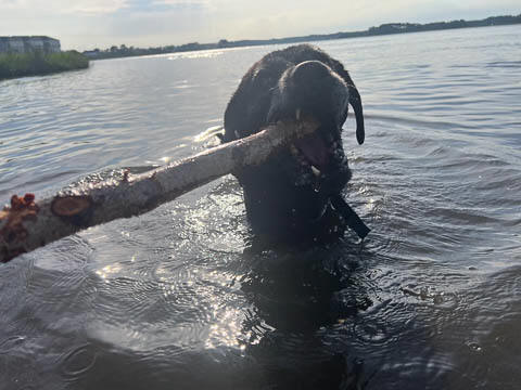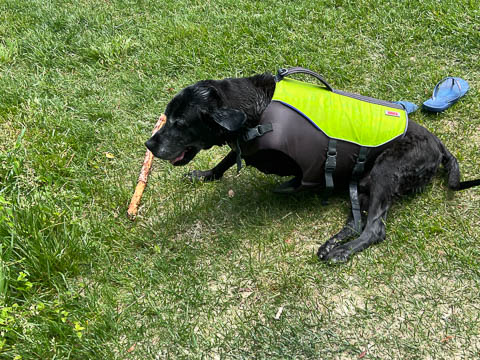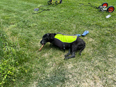 He made it off the small beach and to the grass before lying down to chew on the stick for a bit.