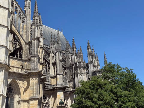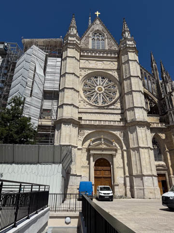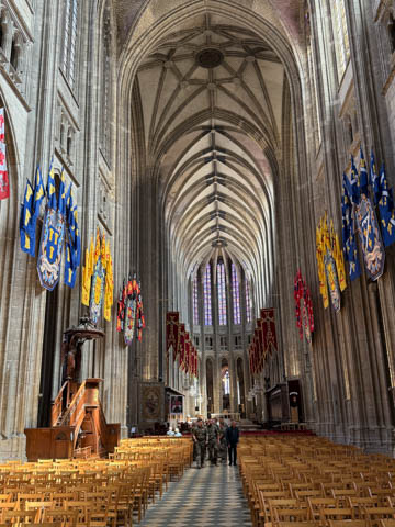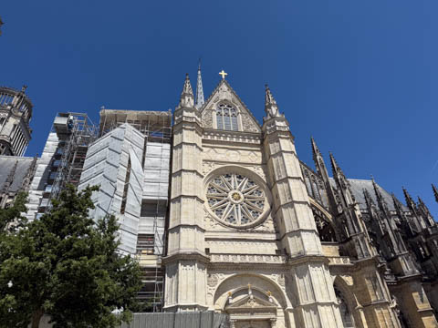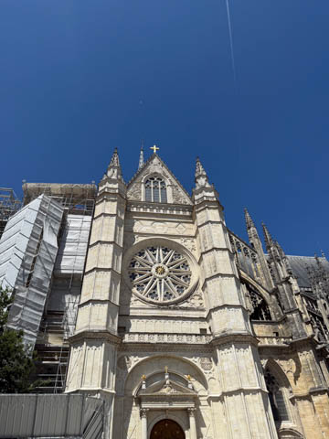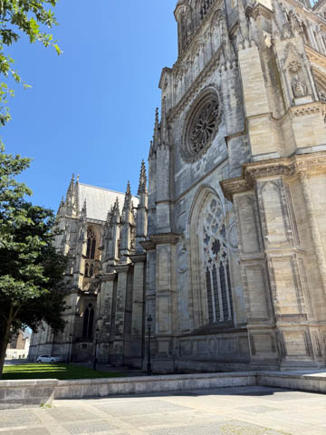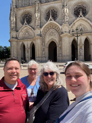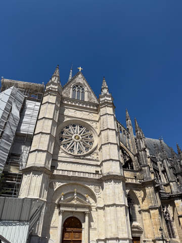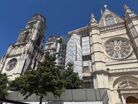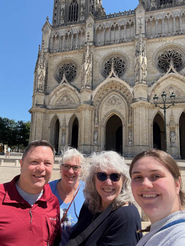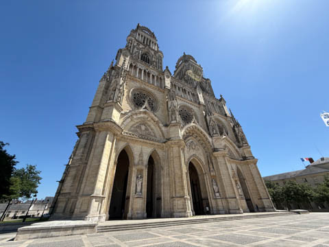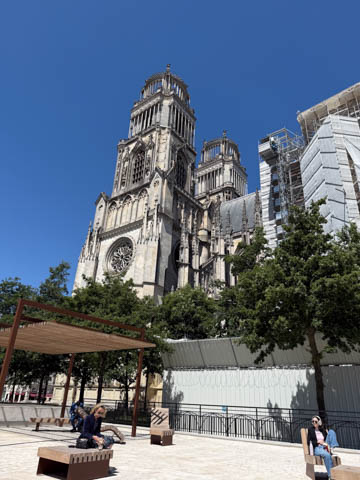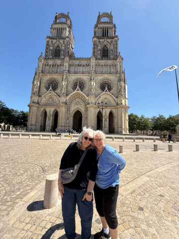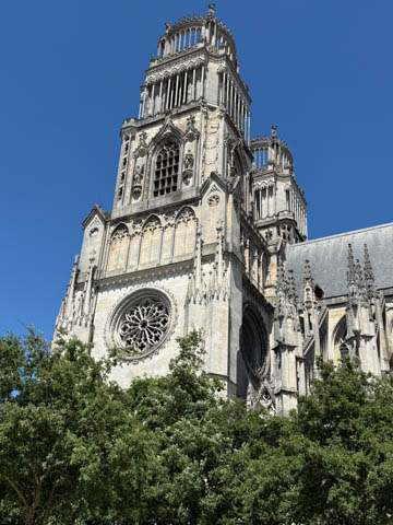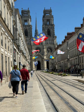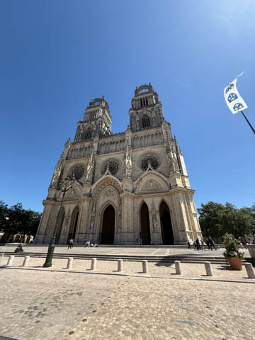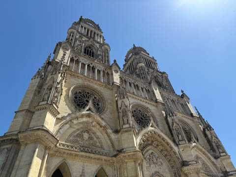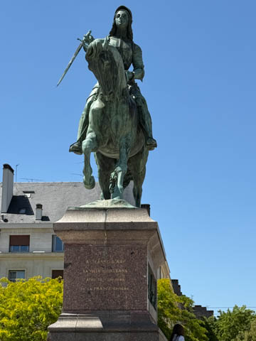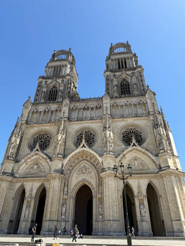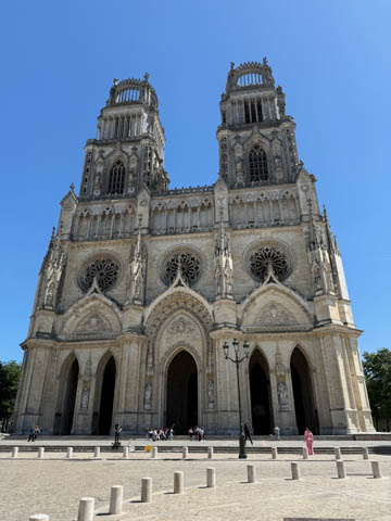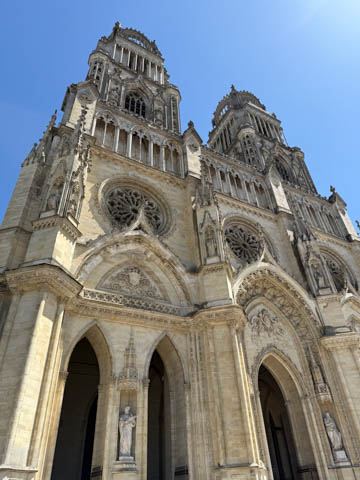 May 2025 (Part 03) France Trip: Day 1: Orleans To celebrate her graduation, we took Alexa on a trip to France! We managed to fit in a lot over two weeks, which was how long we could fit in before Alexa needed to get home for an infusion. We spent about two days in the Loire Valley enjoying chateaus; a couple days in Paris going to the top of the Arc De Triompe and the Eiffel Tower along with a visit to the Louvre,; then a seven day riverboat cruise down the Seine to Normandy with stops to see Monet's gardens in Giverny, Omaha Beach, and the Palace of Versailles; and finally a couple more days in Paris enjoying some more museums. Aunt Cathy joined us for all but the last couple days in Paris, taking advantage of the fact we had to get a separate cabin for Alexa on the cruise. This was so well fit to Alexa and we delighted in just seeing how much she enjoyed her time. We met up with Aunt Cathy at Charles De Gaulle airport. After a rather long wait to get a rental car, then a challenge of getting all of our stuff to fit, we headed off south-southwest of Paris toward the Loire Valley. After the long flight, we really weren't up for a long drive, so we planned to stop in Orleans on the way. This is an ancient city, with roots dating to pre-Roman times and was the capital of the Kingdom of France during the Merovingian period. It is particularly known for the role of Joan of Arc during the siege of Orléans during the Hundred Years' War with England. The city pays homage annually to the "Maid of Orléans," an event we missed by a couple weeks. The Duke of Orleans is the namesake of New Orleans in Louisiana (which is named after French King Louis). The capital of the Louisiana territory was named la Nouvelle-Orléans (New Orleans) in honour of Louis XV's regent, the duke of Orléans, and was settled with French inhabitants against the threat from British troops to the north-east. The Cathedral of Orleans stands as one of the largest and last built cathedrals in France. It was visited by Joan of Arc during the siege of Orleans and is now known for a series of stained glass windows depicting Saint Joan's life. This ancient site featured a Roman temple, which may have been built on an even older Roman pagan temple dating to the 1st century based on archeological evidence. The first Roman Catholic basilica was built in the fourth century, which grew large enough to host the coronation of two kings in the ninth century. A new Romanesque cathedral was built after the basilica, along with the town, was destroyed by fire in 989. This cathedral partially collapsed in the late thirteenth century due to structural problems. The current Rayonnant Gothic style (High Gothic or French Gothic, similar to Notre-Dame de Paris) cathedral dates to the rebuild at this time and was built between 1288 and 1530, taking 243 years to build with construction halted by the Hundred Years War. Shortly after, during the Wars of Religion, the cathedral was looted in 1562, at the same time as other churches in Orléans, and in 1568, the building was partially destroyed by Protestant Huguenots, who destroyed the medieval steeple and arches. In 1598, Henry IV of France ordered a rebuilding project completely restoring the cathedral. Construction promptly started in 1601, with the first stone being laid by Maria de Medici (who we would hear a lot about at several of the Loire Valley chateaus). Most of the structure was rebuilt similarly to its predecessor, however, notable additions added included the addition of flying buttresses, vaults to the transept, and the replacement of the old Gothic facades with a mix of Italian Gothic and Classical styles. In addition to this, the demolition of the main entrance marked the removal of the last remaining part of the original Roman cathedral. In the late 18th century the original Romanesque towers of the facade were replaced by the more imposing towers seen today, and the main bell tower above the transept crossing was replaced by a slender steeple in the Gothic style. The cathedral was consecrated by Charles X in 1829, nearly 600 years after its initial completion, and despite functioning as a gothic cathedral, Orleans Cathedral was designated as a basilica by Pope Pius IX. Unlike other cathedrals around France at the time, cathedral suffered little damage during World War I but sustained severe damage during World War II, first by artillery from German forces during the Battle of France, then by Allied bombings towards the end of the war. However, extensive restoration work was initiated after the war, and still continues today We took some pictures outside the cathedral, but instead of heading inside right away, we wandered off into town in search of lunch first.