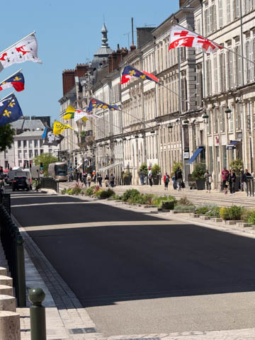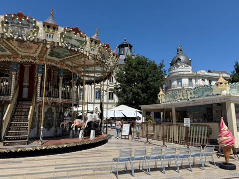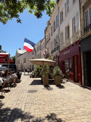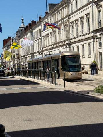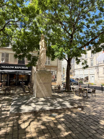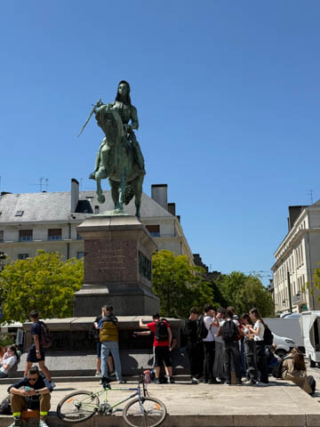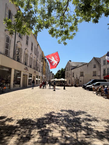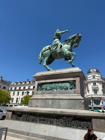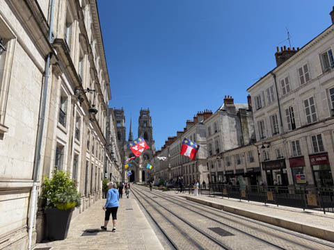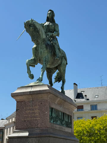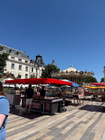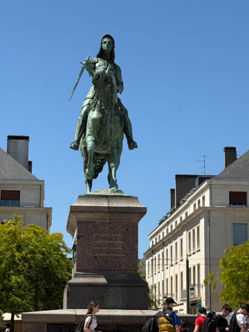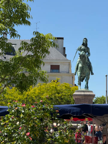 We eventually found Place du Martroi, the heart of the city which featured an equestrian statue of Joan of Arc at its center. There was a small town market in progress, where we got some fruit.