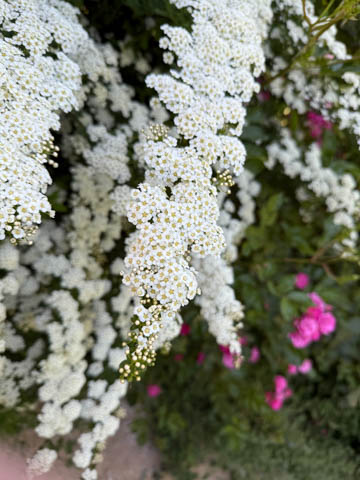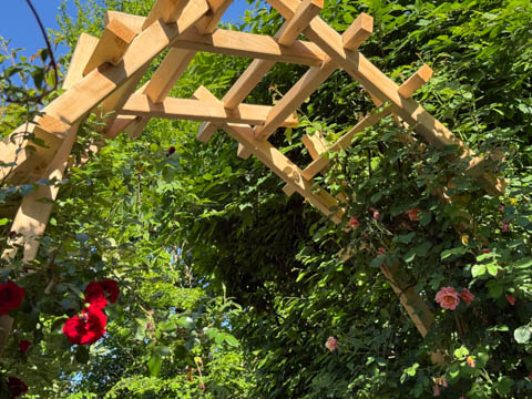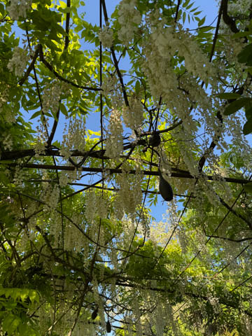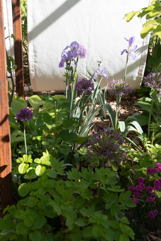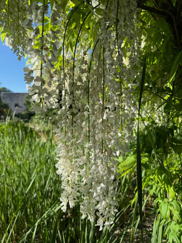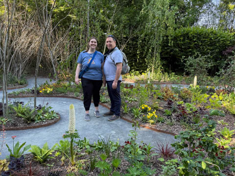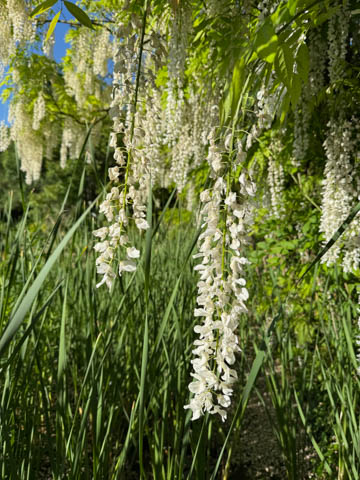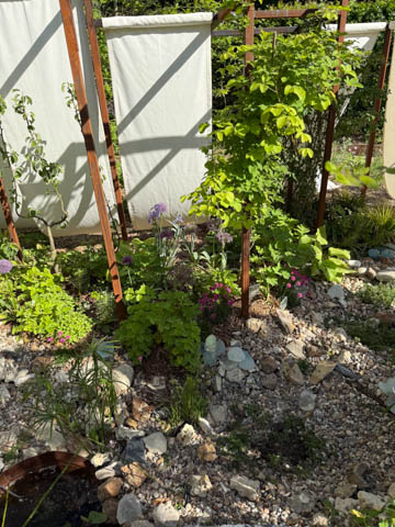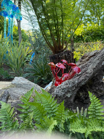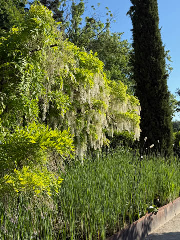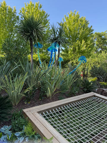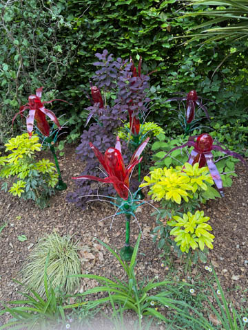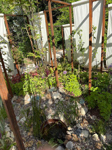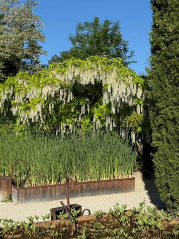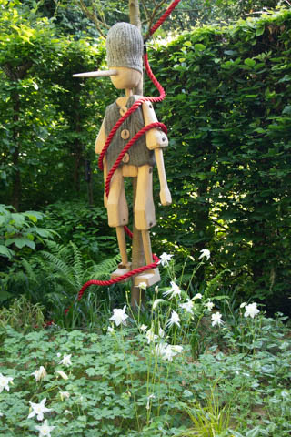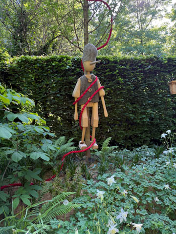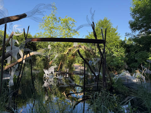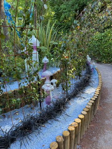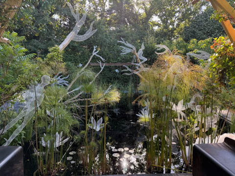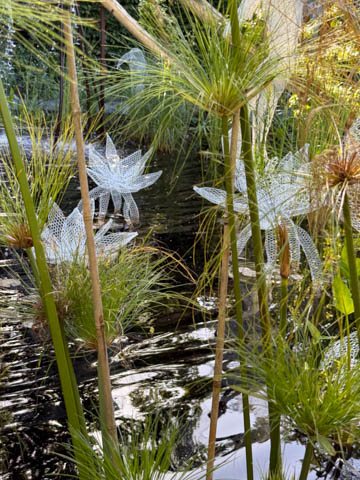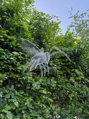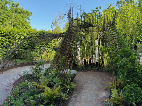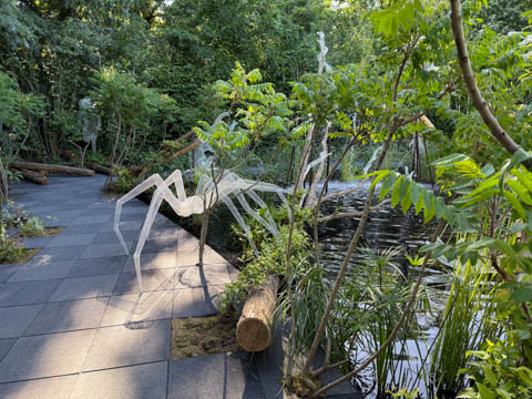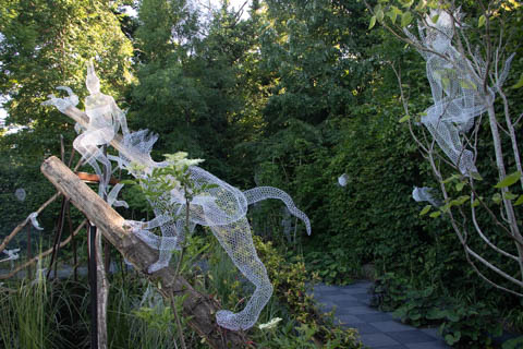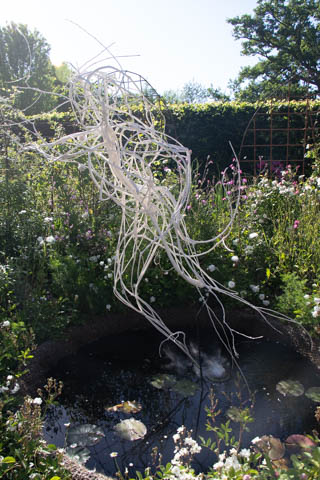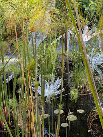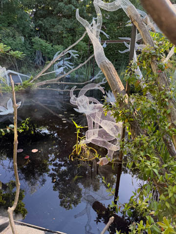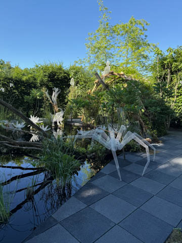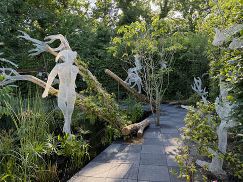 The next garden fascinated all of us. The display was called Le Jardin Des Songes (the Garden of Dreams). Inspired by a 1499 work of the same name, the garden "merges reality with that of fantasy, visions and apparitions. Sculptures fashioned out of white wire netting change the architectural ruins of the original novel into allegories of Nature. The water appears behind a pergola inspired by Leonardo da Vinci, symbolizing knowledge. All around, perched on branches, suspended in the sunshine, emerging from the water and bursting forth from the aquatic or climbing plants, between mist and dappled light, hybrid beings appear (winged nymph, butterfly-amphibian, epiphyte-bird, root-insect) — half-plant, half-animal, almost human figures. The sculptures celebrate the four fundamental elements of our existence: earth, water, air and fire. Thanks to their gossamer, faint outlines, the sculpted apparitions flit between the real world and the world of dreams, just like the visions of Poliphilus. Trickles of water (symbolizing rain) and evocations of mist (symbolizing evapotranspiration) accentuate the haunted atmosphere of the garden. The spirit of Mother Nature lurks within."