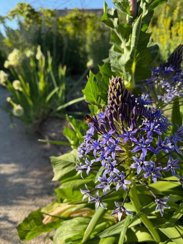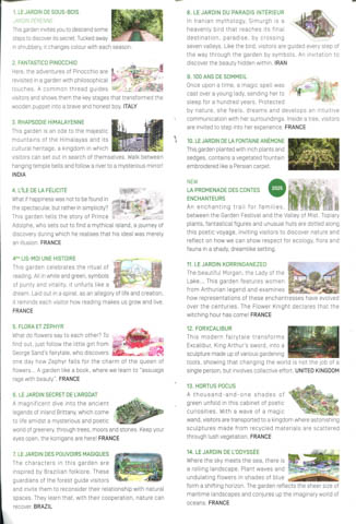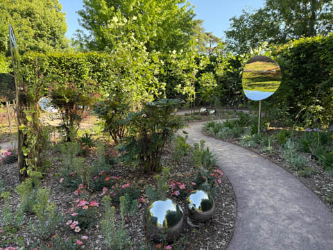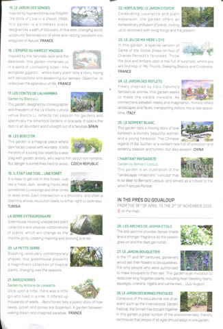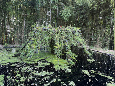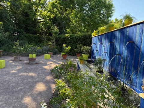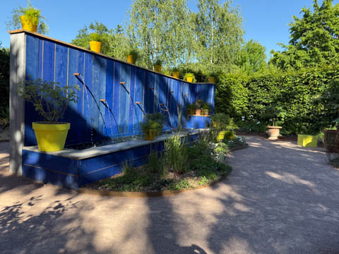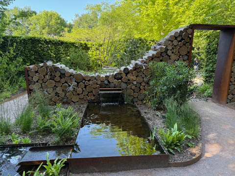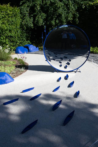 The next was an interesting take on a Zen sand garden titled Rhapsodie Himalayenne, celebrating Tibet and the Himalayas. The garden description stated the mountains are often celebrated as the point connecting Earth to the Heavens. "Himalayan Rhapsody is an ode to these majestic mountains and to the intangible cultural heritage they have embodied over the centuries. A powerful glacial river, its bed formed from fine gravel, flows along a path of bare stones between mossy mounds. A series of brass temple bells, hanging from indigo-coloured poles, marks the entrance to this kingdom. Boats, in the same shade of indigo, float on the winding riverbed, towards a large circular mirror. These traditionally crafted boats, an allegory of introspection, each symbolize the journey of someone searching for themselves, as far as the mirror’s reflection on their own life."