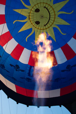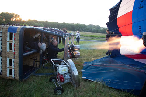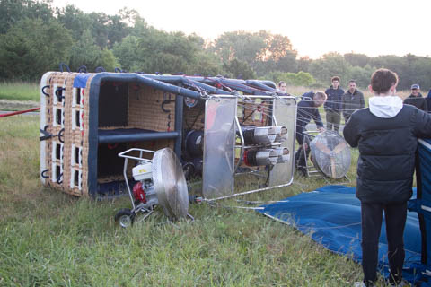 With the basket on the side, they used two big fans to help inflate the envelope. They then used the burners to heat up the air, helping the enveloped start to rise.