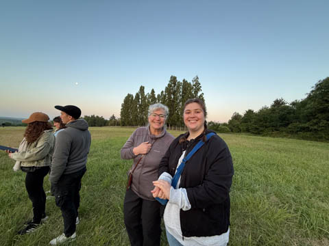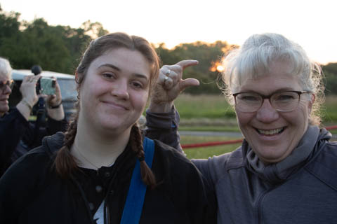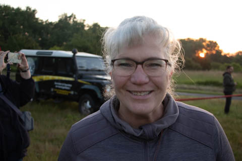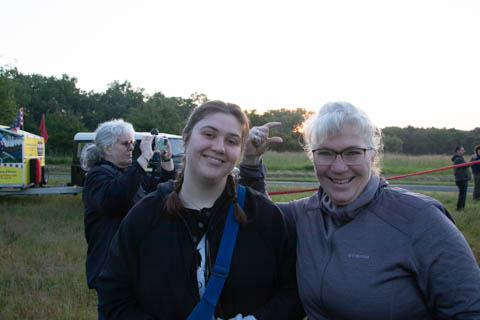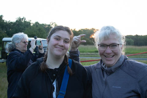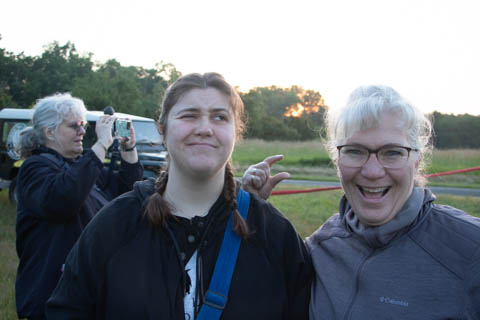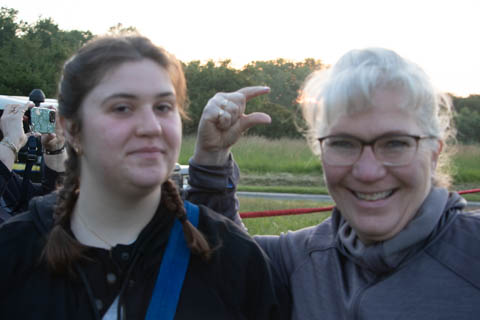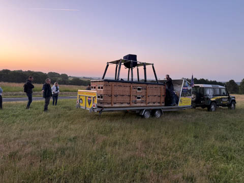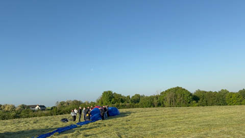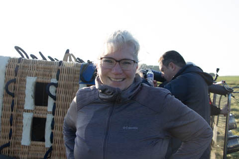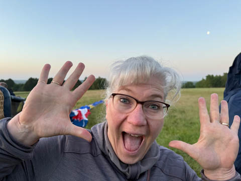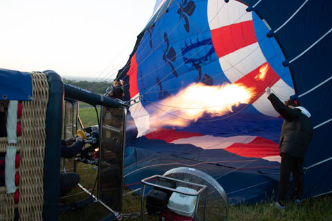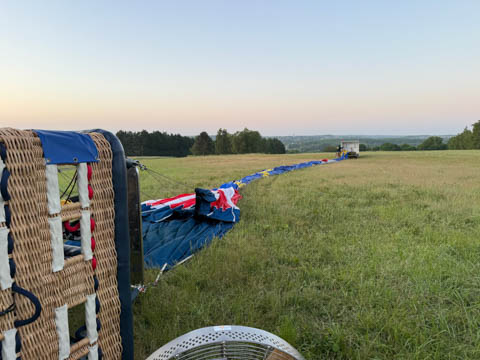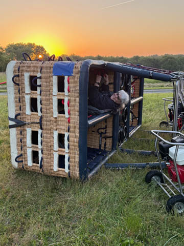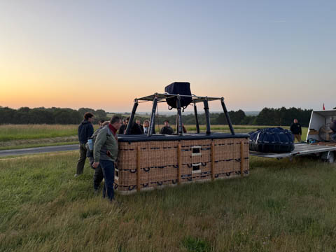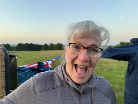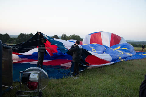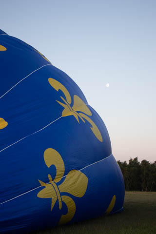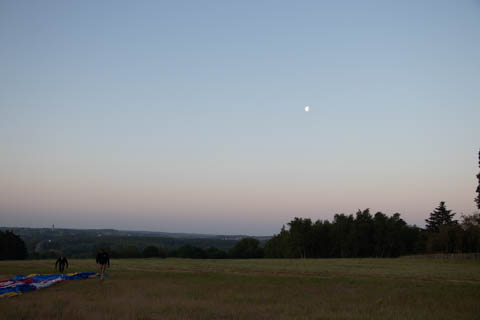 Most of us were recruited to help pull out the envelope, then help move the basket into position and tip it over to be mated with the lines from the envelope. Still pretty early and we could see the moon again. It was pretty clear and we were at an elevated spot, giving us a pretty good view of the countryside even before we launched.