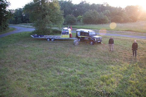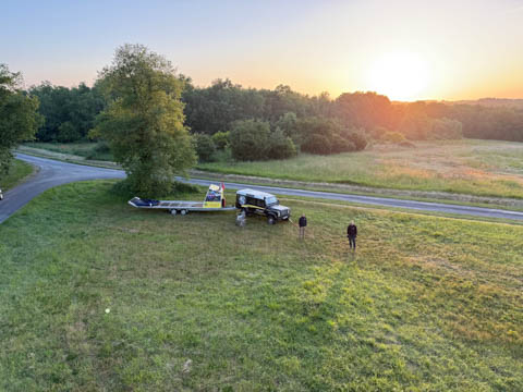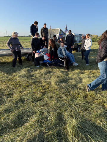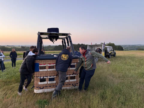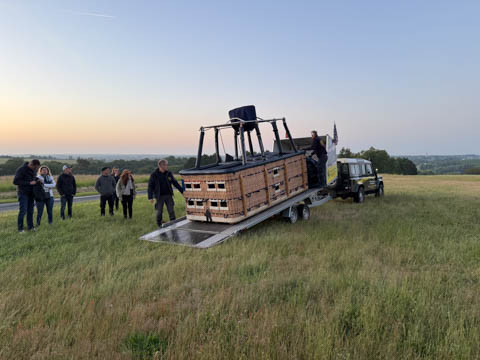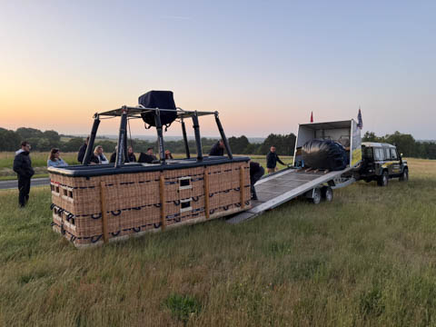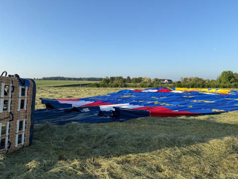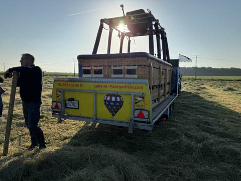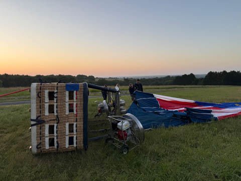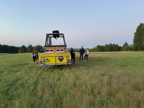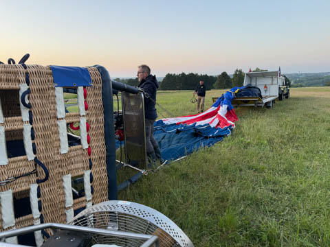 The chase car joined us almost before we were out of the basket. We were all recruited again to help fold and stuff the envelope into a huge bag, then we all laid on the bag to help push out the air and get it pulled tight. The boys helped lift it onto the trailer. Glad for the winch to get the basket on. Once everything was all set, they moved the rig closer to the road and brought out some refreshments.