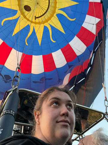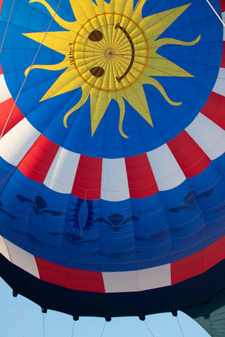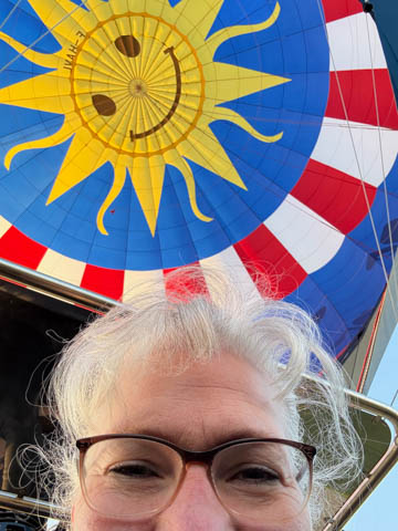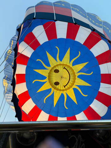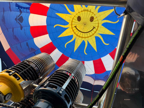 As the balloon was inflating, the pilot related that the enveloped had a 2500 square-meters surface area and could hold 10,000 cubic-meters of air (although the company website said 7,000 cubic-meters). It was made by Kubicek Balloons in 2018. Rise and shine sunshine.
