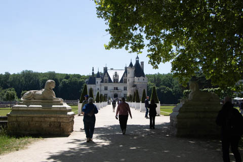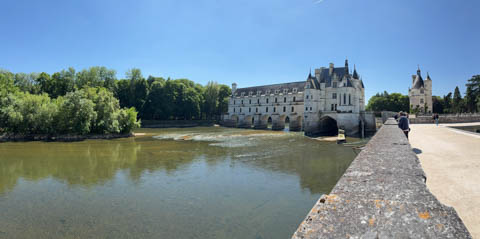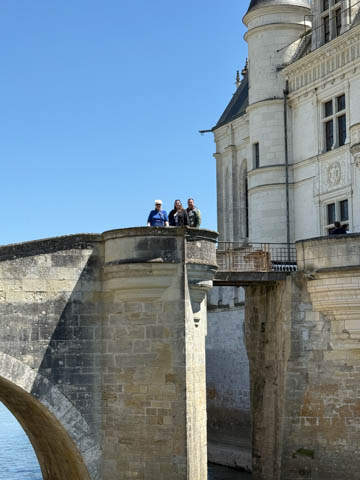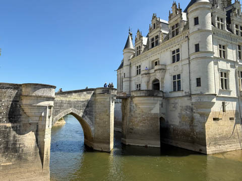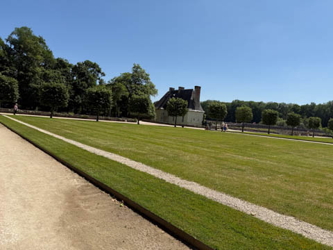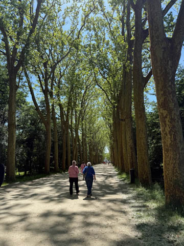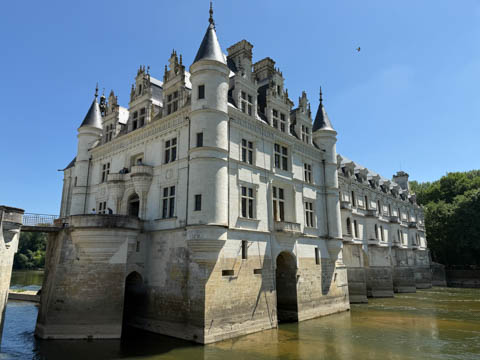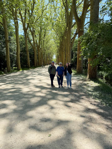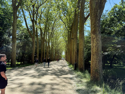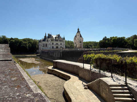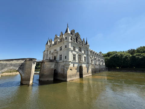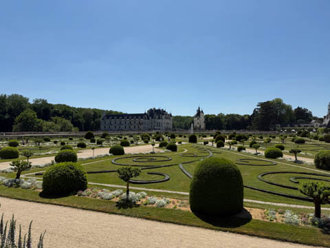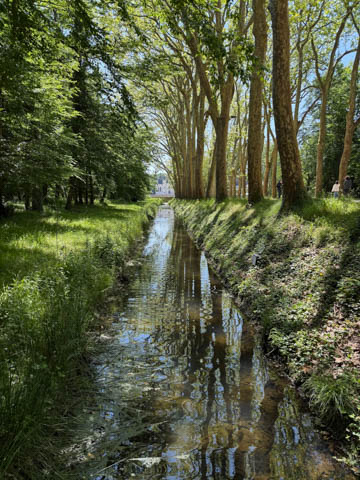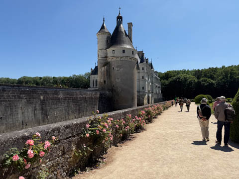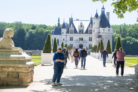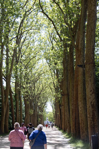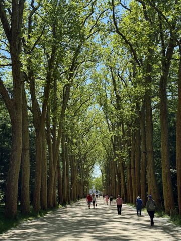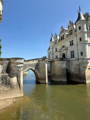 May 2025 (Part 06) France Trip: Day 2: Chateau De Chenonceau After the balloon ride, we headed back to our hotel to clean up, then went back out to go to Chateau De Chenonceau which spans the river Cher about 28 miles upriver of where it joins the Loire River. This is considered one of the most beautiful French chateaus and the most visited chateau after Versailles. The estate dates back to the eleventh century, but the original château was torched in 1412 to punish the owner, Jean Marques, for an act of sedition. He rebuilt a château and fortified mill on the site in the 1430s. Thomas Bohier, Chamberlain to King Charles VIII of France, purchased the castle in 1513, demolishing it except for the original keep. He built an entirely new residence between 1515 and 1521, using it to host French nobility including King Francis I twice. The crown seized the estate for unpaid debts in 1535, and Henry II later gifted it to his mistress, Diane de Poitiers in 1547. She added the arched bridge over the river and had the extensive gardens built. After King Henry II died in 1559, his strong-willed widow and regent Catherine de' Medici forced Diane to exchange it for the Château Chaumont. Queen Catherine then made Chenonceau her own favorite residence, adding a new series of gardens, the grand gallery over the bridge, and other extensions. As Regent of France, Catherine spent a fortune on the château and on spectacular nighttime parties. In 1560, the first-ever fireworks display seen in France took place during the celebrations marking the ascension to the throne of Catherine's son Francis II. Upon Catherine's death, in January 1589, the château went to her daughter-in-law, Louise of Lorraine, wife of King Henry III, who wandered around the chateau in mourning clothes for 11 years after the King's assassination. The estate past to King Henry IV and gradually fell out of royal favor, with many of the statues being sold off an eventually winding up in the Louvre. In the mid-1700s, the estate hosted many French Enlightenment figures, and even housed Jean-Jacques Rousseau who was a tutor to the owner's son. The chateau was saved from destruction during the French Revolution because it was the only bridge over the river for many miles. It was later used as a hospital during World War I, was bombed by both the Germans and Allies in World War 2 destroying many of the windows, and provided a vital link for the resistance during the war as it provided a safe bridge to travel between free Vichy France and occupied France as it straddled the demarcation line between the unoccupied and occupied zones. There was a longer walk to the chateau along a tree lined walk flanked by small water channels.