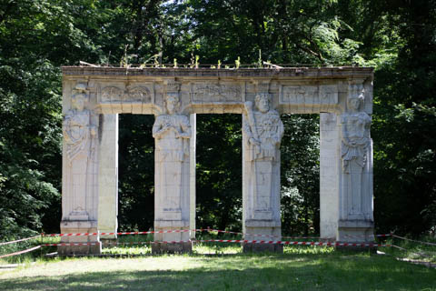 There was an arch featuring Caryatids (sculpted female figures serving as architectural support taking the place of a column or a pillar supporting an entablature on her head) similar to the more famous ones on the Acropolis in Athens.