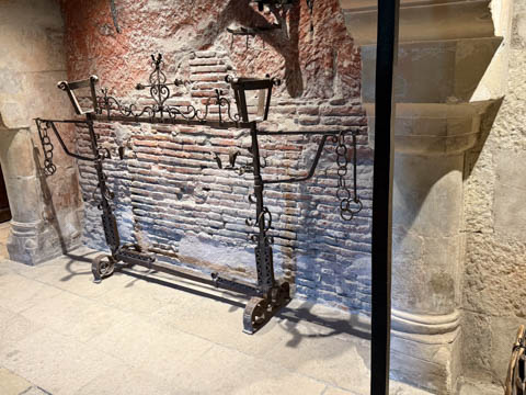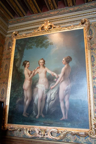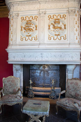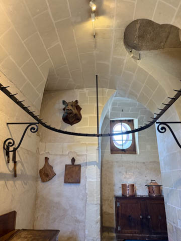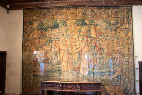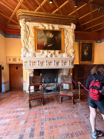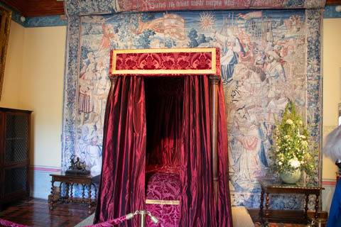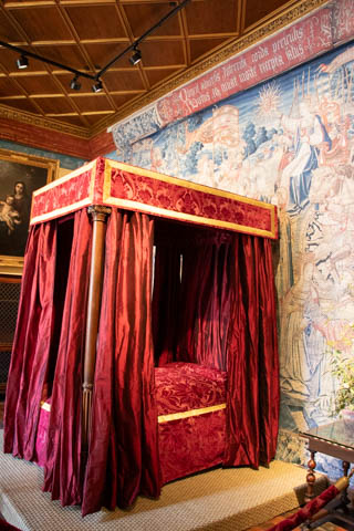 Here is Queen Catherine's bed chamber (the tapestry may be from the period, but the bed is clearly a replica) along with the great hall over the trestle bridge.