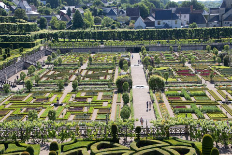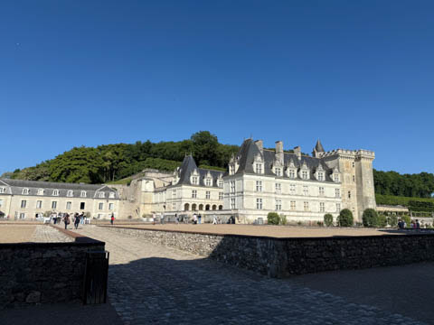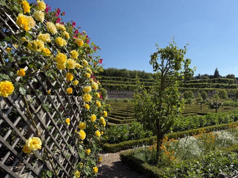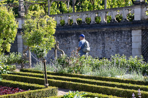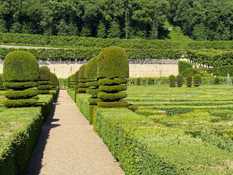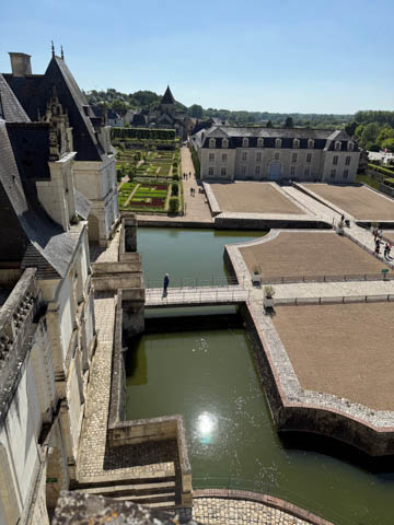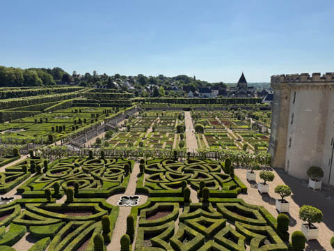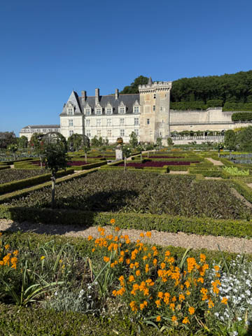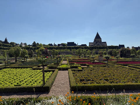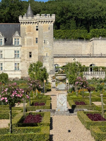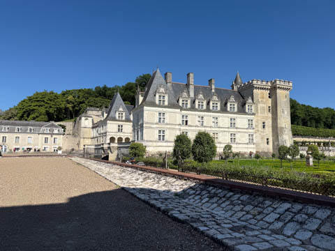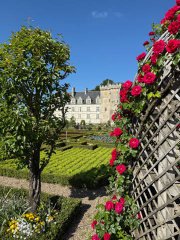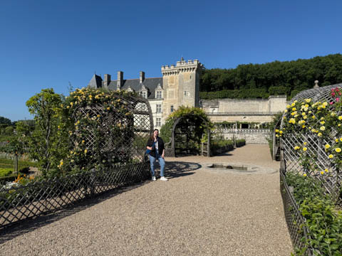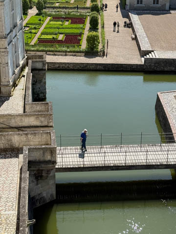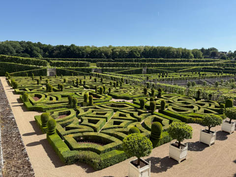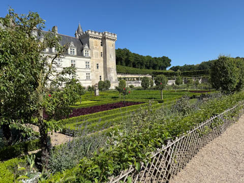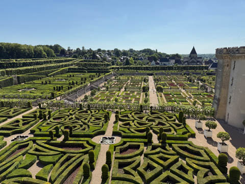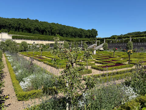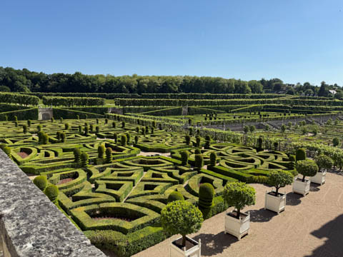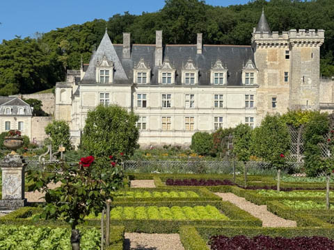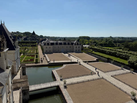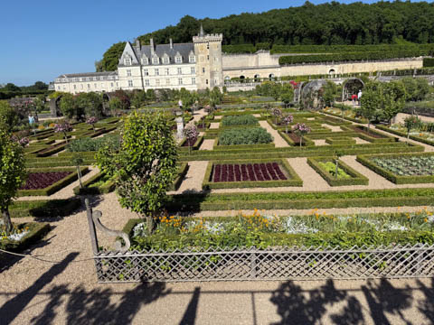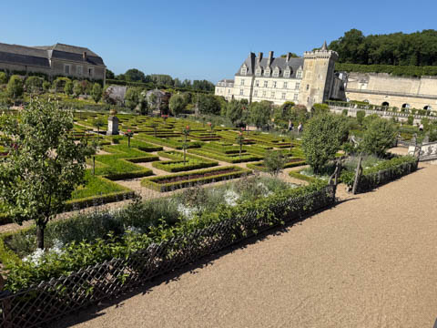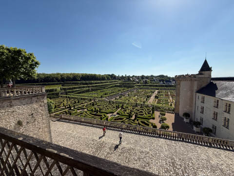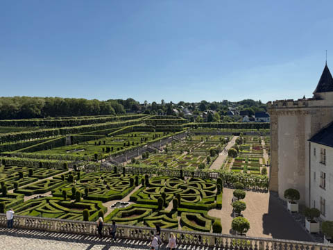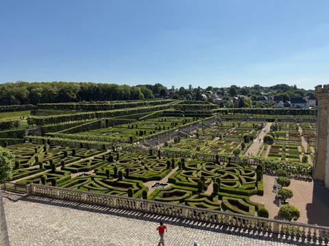 May 2025 (Part 07) France Trip: Day 2: Chateau De Villandry Our next stop on this amazing day was at the Chateau De Villandry, which is famous for its exquisite formal gardens, which is about 45-minutes west of Chenonceaux just upstream of where the Cher River joins the Loire River. This was the sight of a fortress since the 12th century, where Henry II Plantagenet, King of England, signed the Peace of Columbiers in 1189 to recognize his defeat by Phillippe Auguste, King of France. The estate was acquired in the early 16th century by Jean Le Breton, France's Controller-General for War under King Francis I, and a new château was constructed between 1532-1536 around the original 14th-century keep. This was the last of the big chateaus built during the Renaissance. As it was built, it's architecture became more constrained and classical, shedding much of the Italian design influences and adopting a more French style which prefaced the Henry IV style. During the French Revolution the property was confiscated and in the early 19th century, Emperor Napoleon acquired it for his brother Jérôme Bonaparte. The estate was purchased in 1905 by the Carvallo family, who spent a fortune restoring the chateau and the gardens to their Renaissance glory. We opted to visit only the gardens and headed inside. The gardens span seven hectares of the 15 hectare estate, bordered by a forested hill, the village, and the flood plains of the Cher River. Cathy opted for a route without stairs, while the the girls headed to the left and started climbing up the side of a hill to an overlook. Steve took a circuitous route to join them.