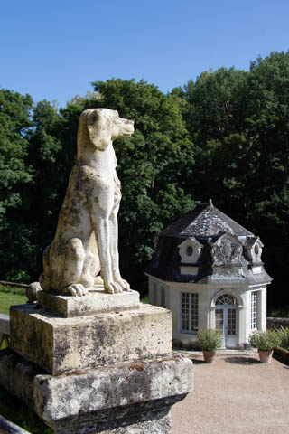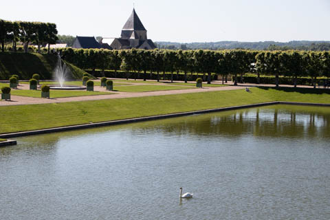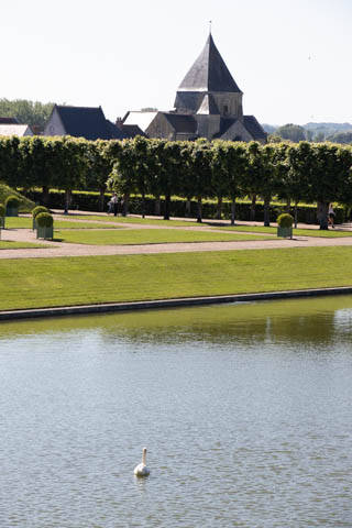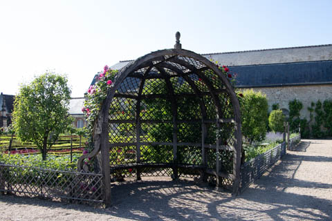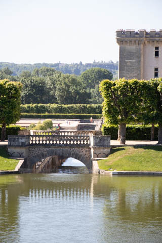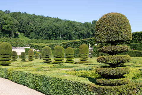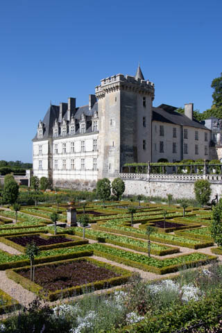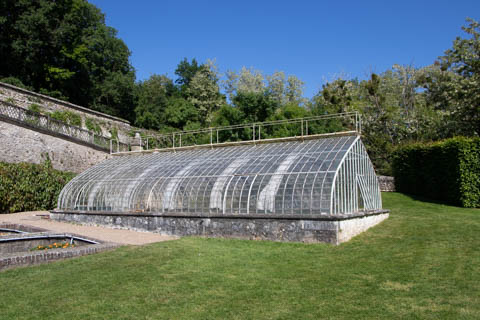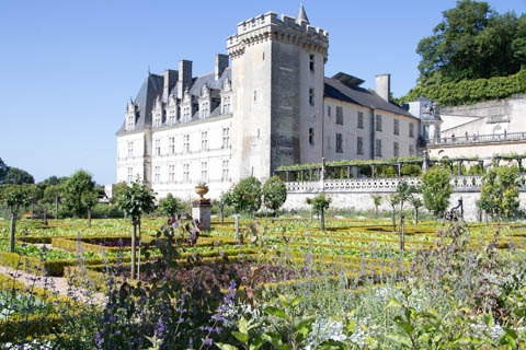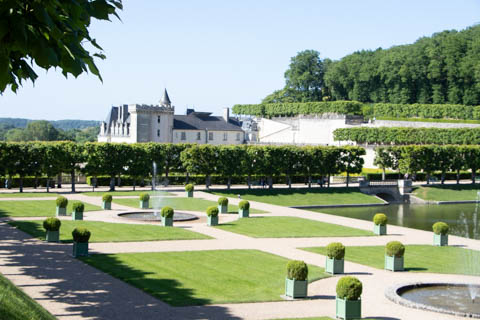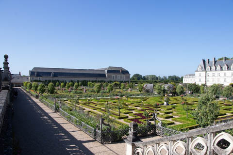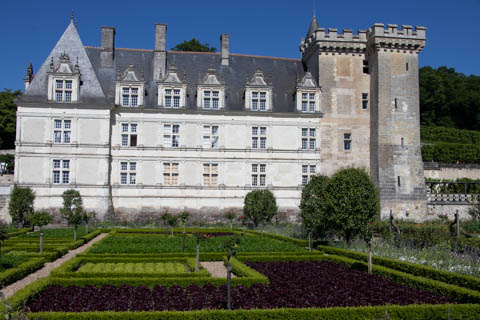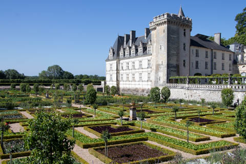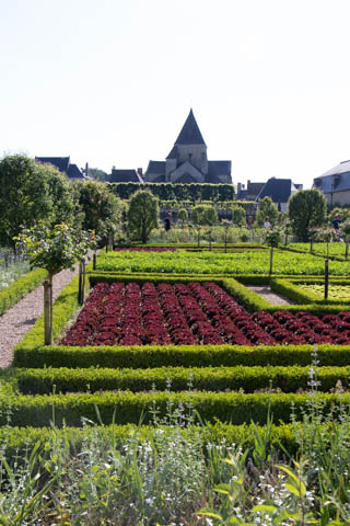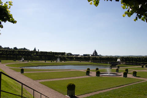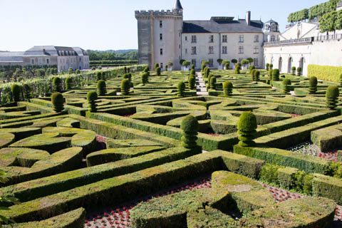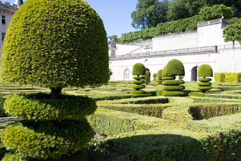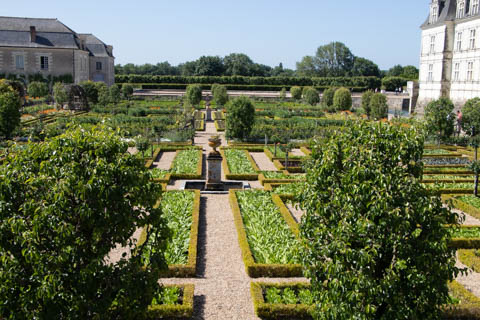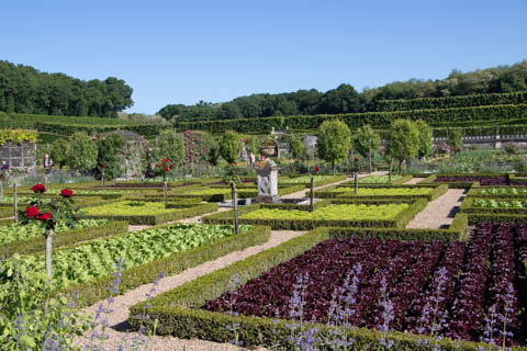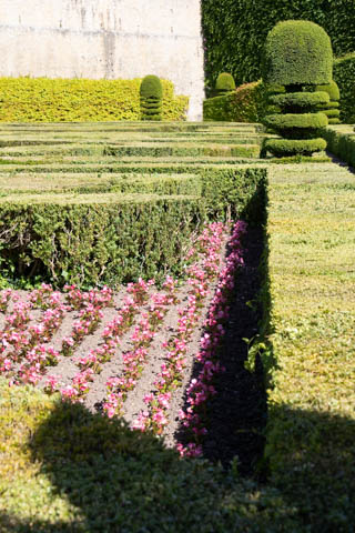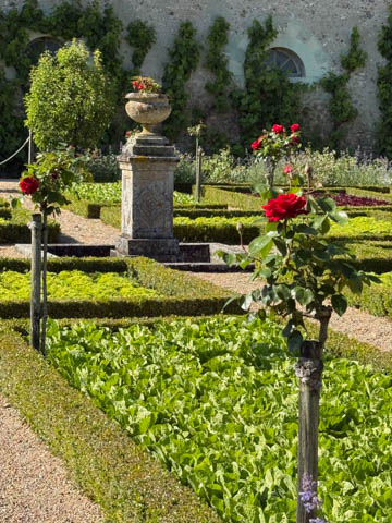 The four square gardens next to the chateau form the love gardens with squares representing tender lover (with four hearts separated by little flames), passionate love (with heart shapes shattered by passion), flighty love (with butterflies in the middle and love letters), and tragic love (with dagger blades and blood red flowers). The next group of garden squares under the retaining wall was the Garden of the Crosses which featured designs with a Maltese cross, Languedoc cross, and a Basque cross.