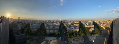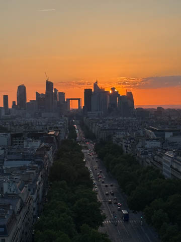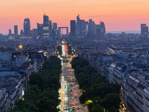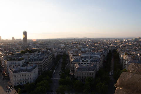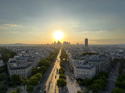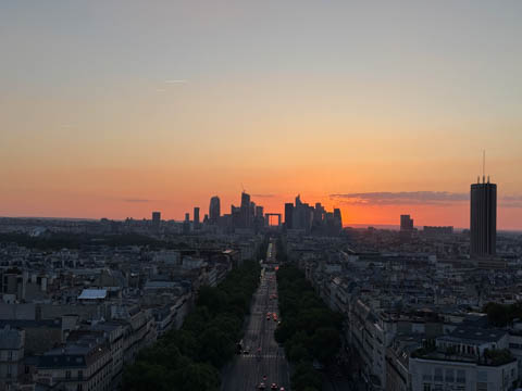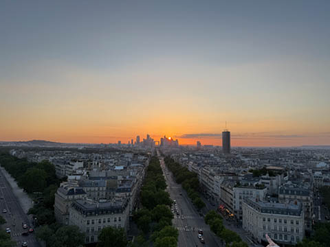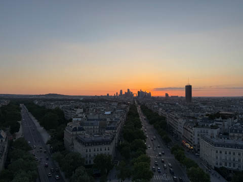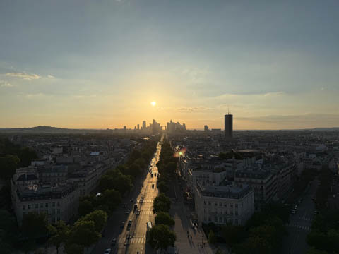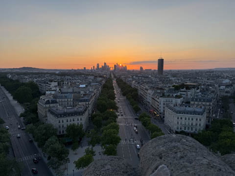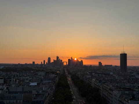 The sunset to the west was shaping up nicely, but was clearly setting right in line along the Avenue Charles de Gaulle and behind a set of high-rise buildings to the west so wouldn't make for good pictures. The box-like building hollow in the middle is the Grande Arche de la Défense. This was built in 1982, completing a line of monuments that forms Paris's Axe historique all in a line from the Louvre along the Avenue des Champs-Élysées and the Avenue Charles de Gaullewhich includes the Arc de Triomphe du Carrousel, the Arc de Triomphe de l'Étoile, and the Grande Arche de la Defense.
