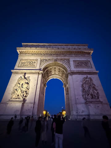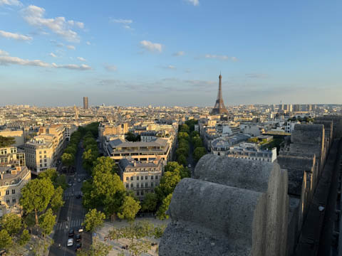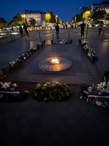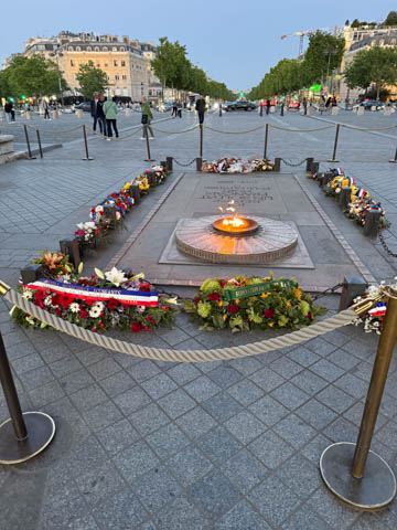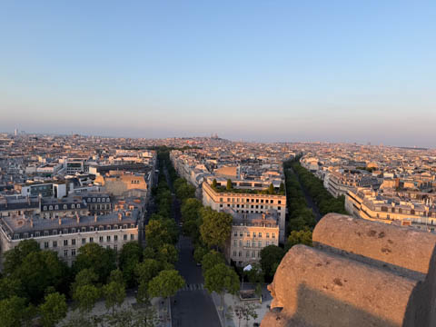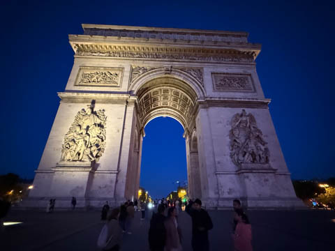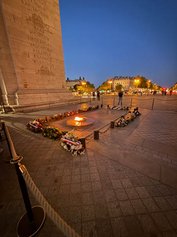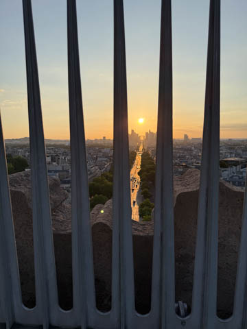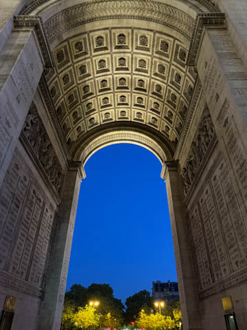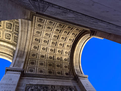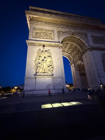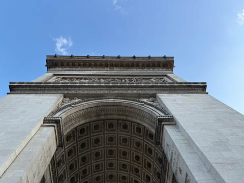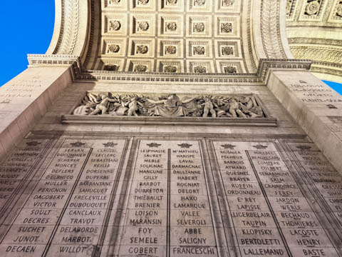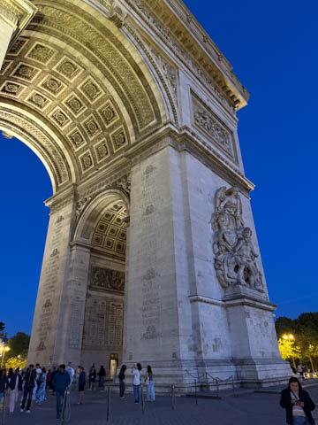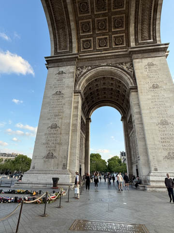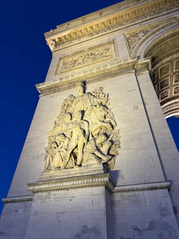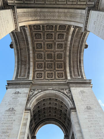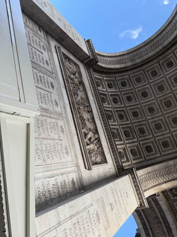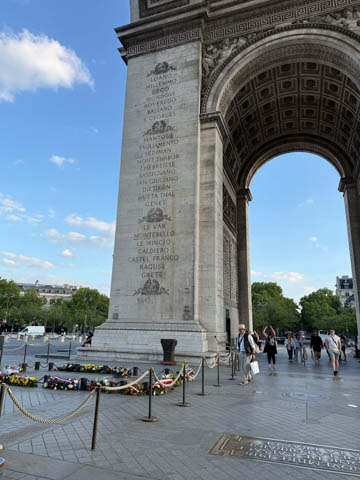 We had tickets to one of the last timeslots to go to the top of the Arc de Triomphe that evening. While I had an image of people marching through the arch, the last time that happened was to celebrate the French victory in World War I. After the war, the French selected an unknown soldier and interned him under the arc on 11 November 1920 at the same time the British simultaneously interned an unknown British solder in Westminster Abbey. The spot under the arch is now considered Dalle sacrée ("Sacred slab") with the tomb and a bronze plaque to commemorate the liberation of Paris in World War II. A ceremony is held at the Tomb of the Unknown Soldier every 11 November on the anniversary of the Armistice of 11 November 1918. It was originally decided to bury the unknown soldier's remains in the Panthéon, but a public letter-writing campaign led to the decision to bury him beneath the Arc de Triomphe. The slab on top bears the inscription: Ici repose un soldat français mort pour la Patrie, 1914–1918 ("Here rests a French soldier who died for the Fatherland, 1914–1918"). First Lady Jacqueline Kennedy remembered the flame after paying their respects during a visit in 1961 and requested that an eternal flame be placed next to her husband's grave at Arlington National Cemetery in Virginia. Technically called the Arc de Triomphe de l'Étoile, it is located at the intersection of twelve radiating avenues and three separate arrondissements (Paris neighborhoods or administrative districts which are arranged and numbered in a clockwise spiral starting with the first arrondissement which is on the right bank and includes the Louvre and Ile de la Cite). The arc was built to honor those who fought and died for France in the French Revolutionary and Napoleonic Wars, with the names of all French victories and generals inscribed on its inner and outer surfaces. It was commissioned in 1806, after the victory at Austerlitz by Emperor Napoleon at the peak of his fortunes. Laying the foundations alone took two years and, in 1810, when Napoleon entered Paris from the west with his new bride, Archduchess Marie-Louise of Austria, he had a wooden mock-up of the completed arch constructed. Following its construction, the Arc de Triomphe became the rallying point of French troops parading after successful military campaigns and for the annual Bastille Day military parade The design is a Neoclassical version of ancient Roman architecture. In the attic above the richly sculptured frieze of soldiers are 30 shields engraved with the names of major French victories in the French Revolution and Napoleonic wars. The inside walls of the monument list the names of 660 people, among which are 558 French generals of the First French Empire; the names of those generals killed in battle are underlined. Also inscribed, on the shorter sides of the four supporting columns, are the names of the major French victories in the Napoleonic Wars. The battles that took place in the period between the departure of Napoleon from Elba to his final defeat at Waterloo are not included The four main sculptural groups on each of the Arc's pillars are: