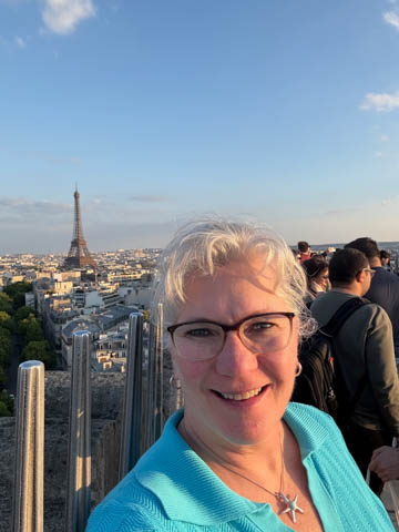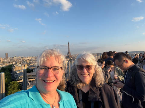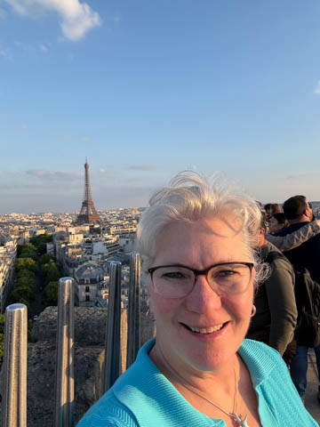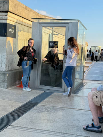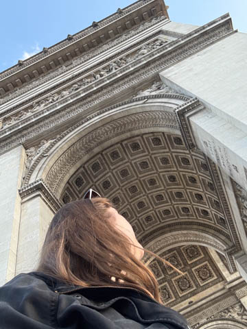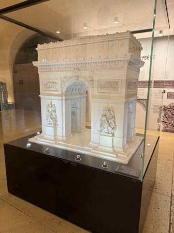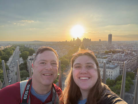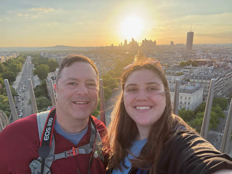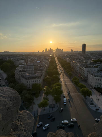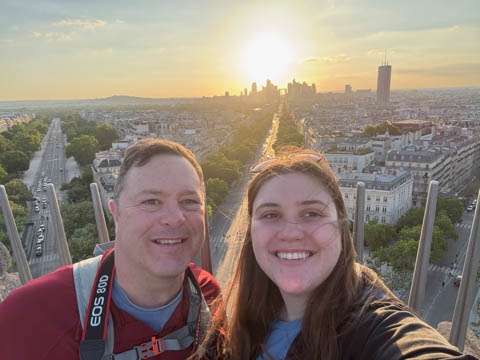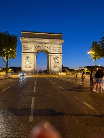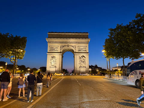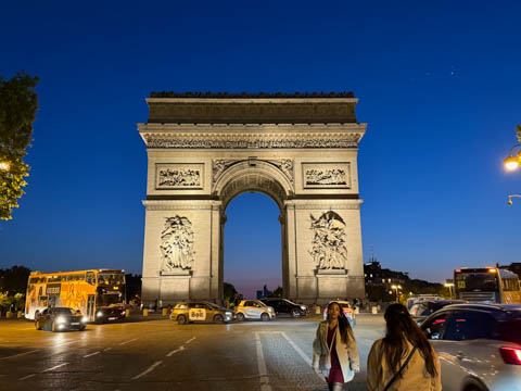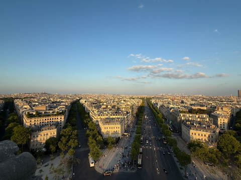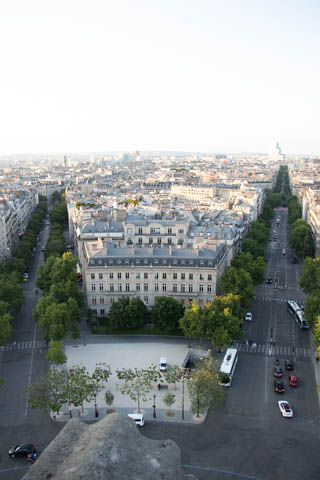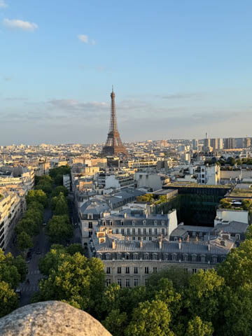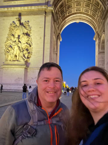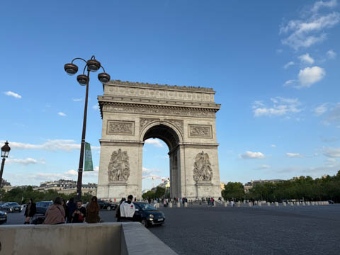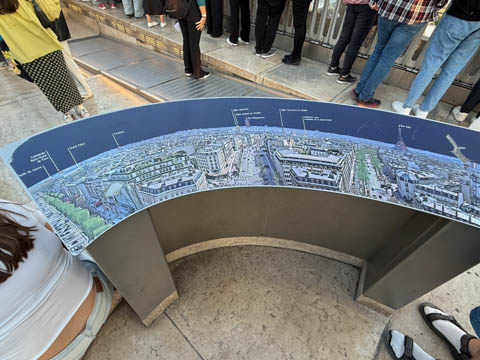 We had tickets to one of the last timeslots to go to the top of the Arc de Triomphe that evening. While I had an image of people marching through the arch, the last time that happened was to celebrate the French victory in World War I. After the war, the French selected an unknown soldier and interned him under the arc on 11 November 1920 at the same time the British simultaneously interned an unknown British solder in Westminster Abbey. The spot under the arch is now considered Dalle sacrée ("Sacred slab") with the tomb and a bronze plaque to commemorate the liberation of Paris in World War II. A ceremony is held at the Tomb of the Unknown Soldier every 11 November on the anniversary of the Armistice of 11 November 1918. It was originally decided to bury the unknown soldier's remains in the Panthéon, but a public letter-writing campaign led to the decision to bury him beneath the Arc de Triomphe. The slab on top bears the inscription: Ici repose un soldat français mort pour la Patrie, 1914–1918 ("Here rests a French soldier who died for the Fatherland, 1914–1918"). First Lady Jacqueline Kennedy remembered the flame after paying their respects during a visit in 1961 and requested that an eternal flame be placed next to her husband's grave at Arlington National Cemetery in Virginia. Technically called the Arc de Triomphe de l'Étoile, it is located at the intersection of twelve radiating avenues and three separate arrondissements (Paris neighborhoods or administrative districts which are arranged and numbered in a clockwise spiral starting with the first arrondissement which is on the right bank and includes the Louvre and Ile de la Cite). The arc was built to honor those who fought and died for France in the French Revolutionary and Napoleonic Wars, with the names of all French victories and generals inscribed on its inner and outer surfaces. It was commissioned in 1806, after the victory at Austerlitz by Emperor Napoleon at the peak of his fortunes. Laying the foundations alone took two years and, in 1810, when Napoleon entered Paris from the west with his new bride, Archduchess Marie-Louise of Austria, he had a wooden mock-up of the completed arch constructed. Following its construction, the Arc de Triomphe became the rallying point of French troops parading after successful military campaigns and for the annual Bastille Day military parade The design is a Neoclassical version of ancient Roman architecture. In the attic above the richly sculptured frieze of soldiers are 30 shields engraved with the names of major French victories in the French Revolution and Napoleonic wars. The inside walls of the monument list the names of 660 people, among which are 558 French generals of the First French Empire; the names of those generals killed in battle are underlined. Also inscribed, on the shorter sides of the four supporting columns, are the names of the major French victories in the Napoleonic Wars. The battles that took place in the period between the departure of Napoleon from Elba to his final defeat at Waterloo are not included The four main sculptural groups on each of the Arc's pillars are: