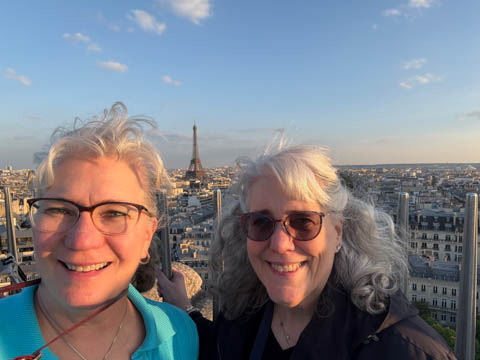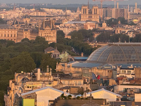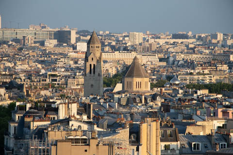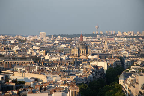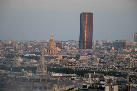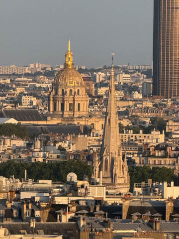 Looking further southeast is the pointed spire of the American Cathedral in Paris, while the dome of the with its golden spire on top just to the left in the distance is the Hotel des Invalides and the Saint Louis des Invalides Cathedral. More to the right is the Eglise Saint Pierre-de-Chaillot catholic church with its more Roman dome and tower. In the distance is the Tour Maine-Montparnasse which is considered an eyesore in the Paris skyline (one guide later referred to it as the middle finger sticking up to Paris).