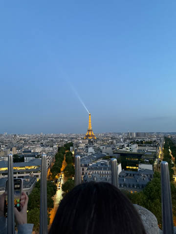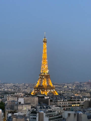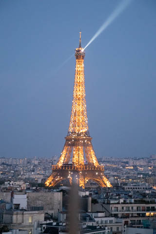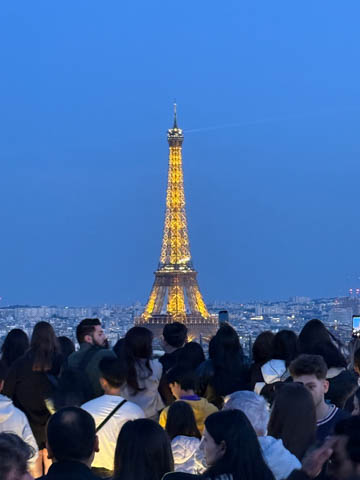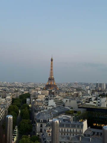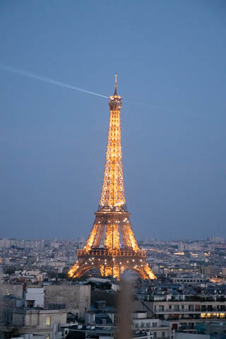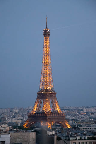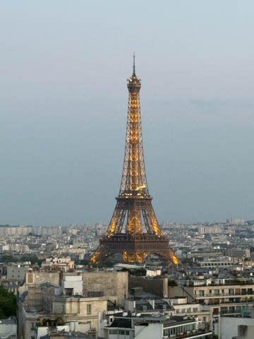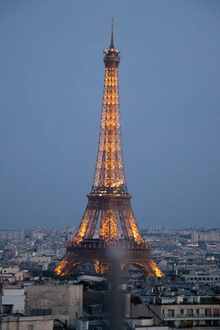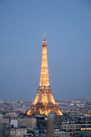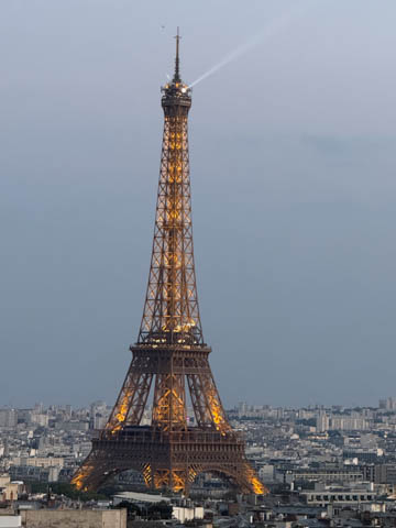The Eiffel Tower to the south lit up at dusk. After dark, on the hour, it was alight with a light display. We waited quite a while to see this display.