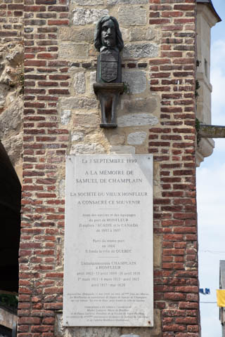 This plaque marked the departure of Samuel Champlain, who departed from Honfleur to explore Acadia and Canada in 1603 to 1607, and departed again from Honfleur in 1608 to found the city of Quebec,