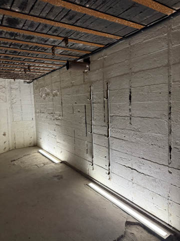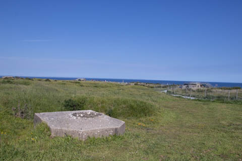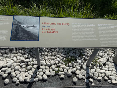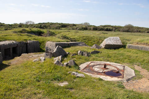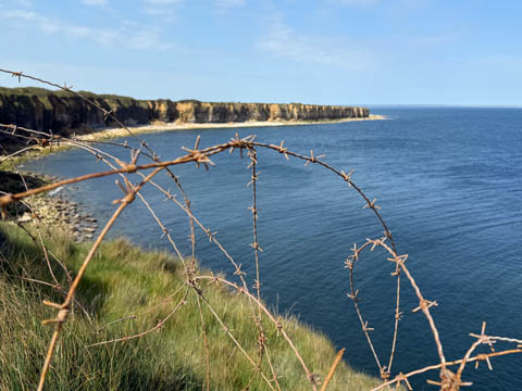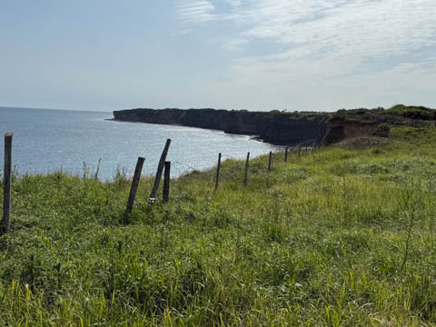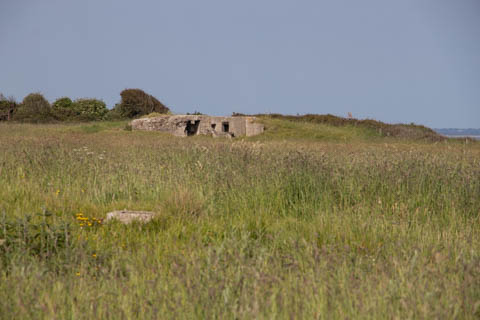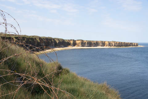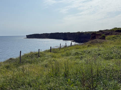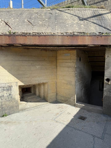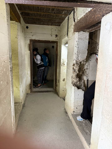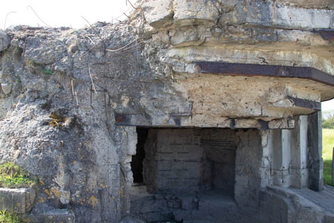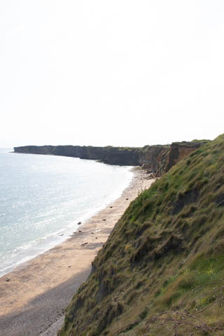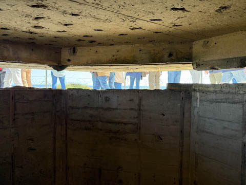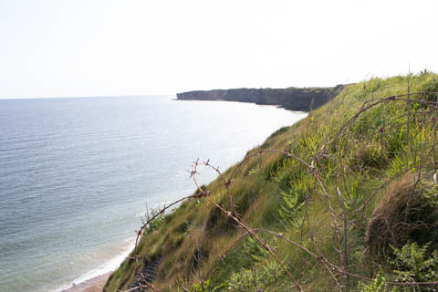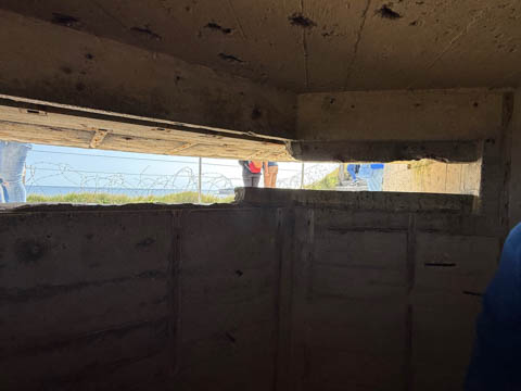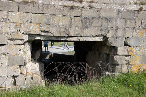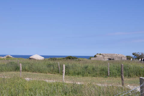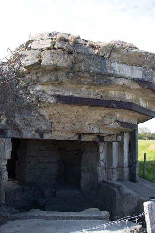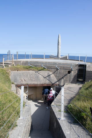Our first stop was at Point du Hoc, a prominent headland between Omaha Beach to the east and Utah Beach to the west. The entire coastline had been fortified as part of the German Atlantic Wall, but it was believed Point du Hoc held six World War I era 155 mm artillery guns positioned in concrete casements. Given their range and position, they represented a singular risk to the landings. The US Provisional Ranger Group (2nd and 5th Ranger Battalions) was assigned the task of attacking and capturing the strong point. In the months leading up to the landing, the Germans were observed removing individual guns and reinforcing the casements. The assault force was carried in ten landing craft, with another two carrying supplies and four DUKW amphibious trucks carrying the 100-foot (30 m) ladders requisitioned from the London Fire Brigade. One landing craft carrying troops sank, drowning all but one of its occupants; another was swamped. One supply craft sank and the other put the stores overboard to stay afloat. German fire sank one of the DUKWs. Once within a mile of the shore, German mortars and machine guns fired on the craft. These initial setbacks resulted in a 40-minute delay in landing at the base of the cliffs, but British landing craft carrying the Rangers finally reached the base of the cliffs at 7:10 am with approximately half the force it started out with. The landing craft were fitted with rocket launchers to fire grapnels and ropes up the cliffs. As the Rangers scaled the cliffs, the Allied ships USS Texas (BB-35), USS Satterlee (DD-626), USS Ellyson (DD-454), and HMS Talybont (L18) provided them with fire support in an attempt to prevent the German defenders above from firing down on the assaulting troops. The 30 m (98 ft) cliffs proved to be higher than the ladders could reach, forcing the Rangers to adapt and overcome. Because of the delayed landing, the planned signal for reinforcements was late and additional Rangers planned for the assault were landed at Omaha Beach instead (where they were instrumental in avoiding a disaster, since they carried the assault beyond the beach, into the overlooking bluffs and outflanked the German defenses). The Rangers made it to the top at Pointe du Hoc about 30-minutes after landing; they had sustained 15 casualties, most of them from the raking fire to their left. The cliffs were defended by the German 352nd Infantry Division and French collaborators firing from above. Upon reaching their main objective of the assault, the artillery battery, they discovered the guns had been removed. Two different patrols found five of the six guns unguarded but ready to use, in a nearby orchard some 550 meters (600 yd) south of the point, (the sixth was being repaired) and destroyed their firing mechanisms with thermite grenades. The Rangers fended off numerous counter-attacks from the German 914th Grenadier Regiment. The men were isolated, and some were captured. During the first night, one patrol from the 5th Rangers that landed at Omaha Beach made it through to join the Rangers. By dawn on 7 June, Rudder had only 90 men able to fight. Relief did not arrive until 8 June, when members of the 743rd Tank Battalion and others arrived. By then, Rudder's men had run out of ammunition and were using captured German weapons. Several men were killed as a result, because the German weapons made a distinctive noise, and the men were mistaken for the enemy. By the end of the battle, the Rangers casualties amongst the 225 soldiers who landed were 135 dead and wounded (77 dead, rest wounded), while German casualties were 50 killed and 40 captured. An unknown number of French collaborators were executed. We first headed out to the point, where there was a small trail along the bluff around one of the casements, which you could go inside.