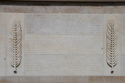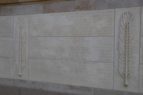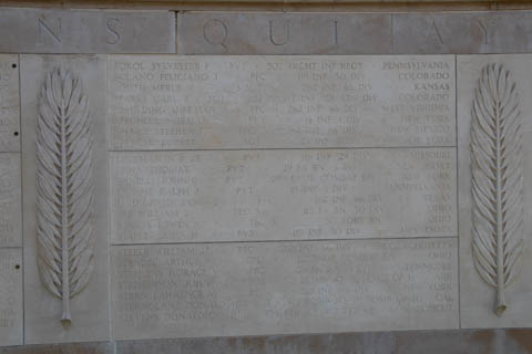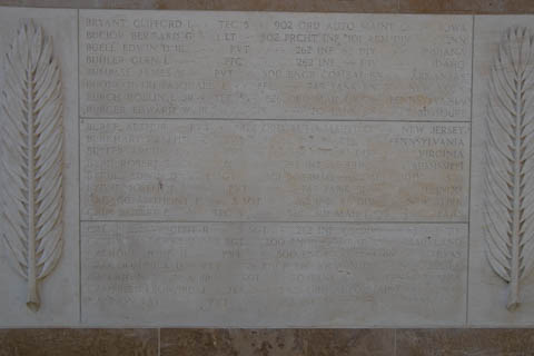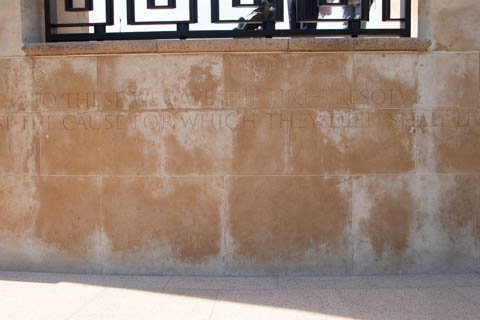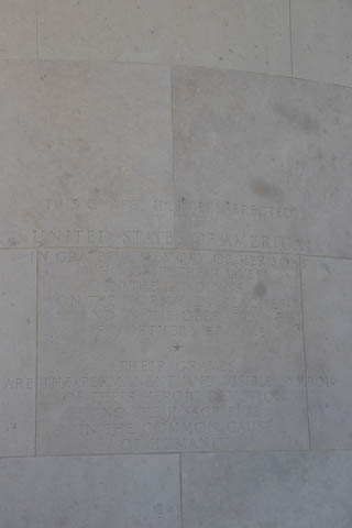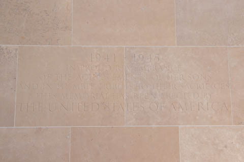 Inscribed in the wall is a quote from General Dwight D. Eisenhower's dedication of the Golden Book at St. Paul's Cathedral in London,: "To these we owe the high resolve that the cause for which they died shall live." The second inscription reads "1941-1945 In proud remembrance of the achievements of her sons and in humble tribute to their sacrifices, this memorial has been erected by the United States of America.