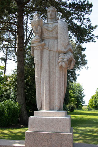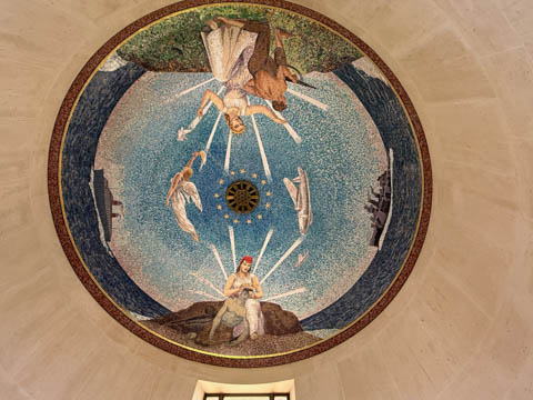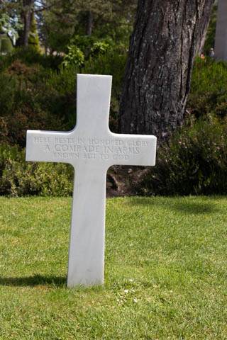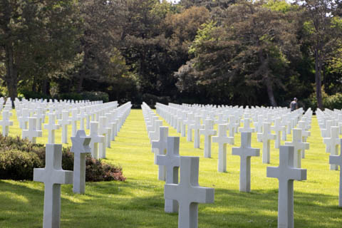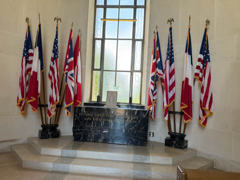 In the center of the cemetery rests a small circular chapel. The ceiling mosaic depicts America blessing her sons as they depart to fight for freedom. The inscription on the outside reads "this chapel has been erected by the United States of America in grateful memory of her sons who gave their lives in the landings on the Normandy beaches and in the liberation of Northern France - Their graves are the permanent and visible symbol of their heroic devotion and their sacrifice in the common cause of humanity."