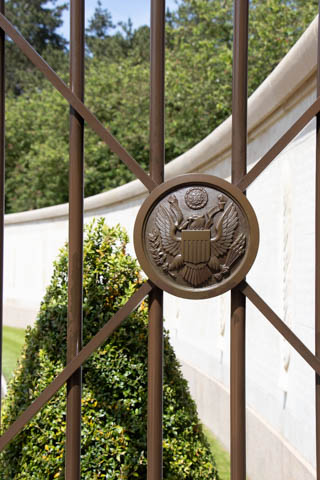 The site includes a memorial with two small alcoves at the ends of a semi-circular colonnade which faces a large reflecting pool.