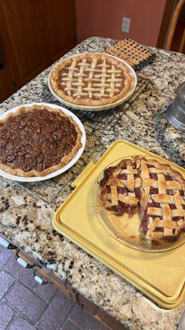 While there, we investigated Bill's freezer and he decided he wanted Nancy to use several items to make pies. She made three gooseberry pies, freezing two and baking one. She also based a cherry pie, a pecan pie (which she had never made before), and made raspberry jam.