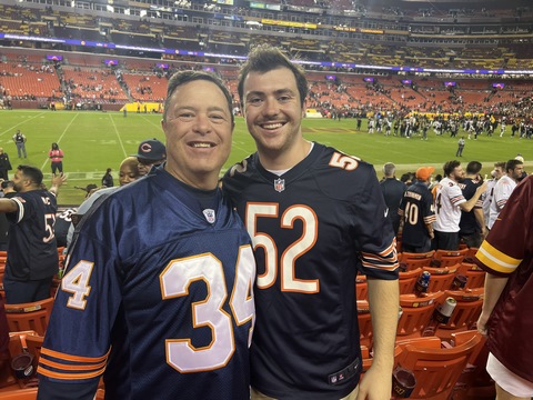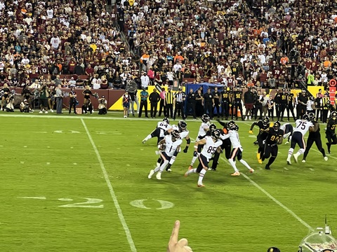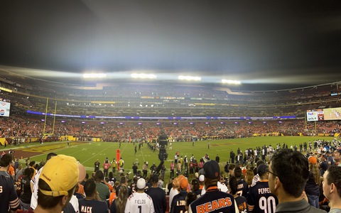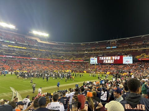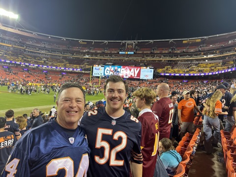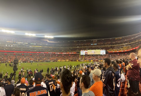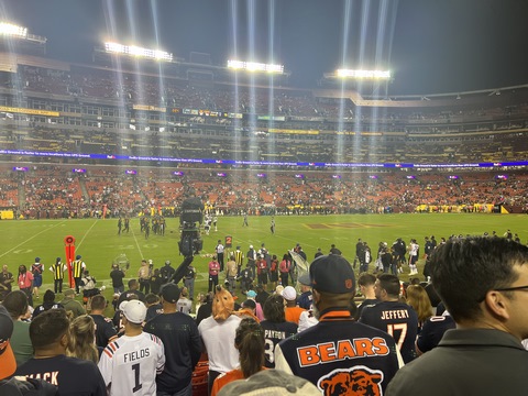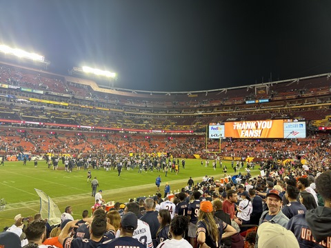 October 2023 (Part 01) Chicago Bears: 40 Washington Commanders: 20 Steve and Andy went to an NFL game in early October, watching the Bears beat the Commanders. They had amazing seats, at the 25 years line and only 10 rows up. We drove down with Andy's friend, Max and his dad, Drew. We thought we allowed plenty of time, but it took the full two-and-a-half hours to get there, so we got to our seats a bit before kickoff. After the game, traffic was incredibly gridlocked, so we wound up playing corn hole in the parking lot. We could have left after two games, especially as it was a bit before 1AM, but we clearly had to play an abbreviated tie-breaker. We got home at almost 2 AM, but it was so worth it. We were very reserved about their chances, but were treated to a solid, end-to-end team win across most aspects of the game. Steve actually recorded two of the touchdowns as they happened right in front of them on what were crucial downs. The 0-4 Bears came into the game among the worst teams in the NFL so far this season and carrying a franchise-worst 14-game losing streak, with their last win coming last October 24th. The entered the game with only 2 sacks in three games. There was also significant controversy in the locker room, with a starting wide receiver acquired recently in a trade being left off the roster amid controversy about his lack of effort (and lack of blocking on the field). It turned out having the boys there to cheer them on was what they needed. They handed the 1-3 Commanders a 40-20 drubbing, which likely solidified the Bear's coaches jobs (for a week at least) and suddenly raised questions about the Commander's leadership team. All of this occurred in front of the new Commander's ownership team. The damage was severe. Chicago had eight scoring drives and amassed 451 yards. It was the fourth consecutive game in which Washington gave up more than 30 points — and it was the Commanders’ third straight loss. The Bears scored on their first five possessions and didn’t punt until the third quarter. The finished with 5 sacks and 11 hits on Howell, the Commander's QB. QB Justin Fields and WR DJ Moore looked in synch, connecting for four touchdowns including an amazing diving face catch in the corner of the end zone right in front of us. The Bears picked apart the defense, drawing first blood at the 2:56 mark. Cornerback Benjamin St-Juste was beaten by wide receiver DJ Moore for a 58-yard completion along the left sideline on a third and nine during the Bears’ opening drive. Then, on third and 14 just three plays later, Bears quarterback Justin Fields went back to his favorite target for a 20-yard touchdown. Second-year safety Percy Butler drifted inside in coverage, leaving the left side of the field without help over the top. Moore slipped past cornerback Kendall Fuller and had a clear lane to the end zone. The crowd at packed FedEx Field was silenced, but Moore, the former Maryland standout, was just getting started. Running back Khalil Herbert collected 34 yards on a run up the middle on Chicago’s second drive, easily slipping through the grasp of rookie cornerback Emmanuel Forbes Jr. to help set up a field goal. Washington’s response: a three-play drive that resulted in the loss of a yard — a gift, really. Chicago happily accepted as Fields again found Moore on third-and-long early in the second quarter for an 11-yard touchdown that extended the Bears’ lead to 17-0. The only thing keeping the Commanders from being shut out in the first half was a 51-yard field goal by Joey Slye. But any shred of momentum was short-lived. After St-Juste stayed glued to wideout Darnell Mooney in coverage to force an incompletion in the end zone and a subsequent field goal, Commanders quarterback Sam Howell was picked off. Chicago quickly scored again, this time on a Cole Kmet touchdown catch from four yards. The Bears led 27-3 at the half. Washington picked up just 84 yards as Chicago amassed 307 in the first half. The Bears had 14 first downs to Washington’s five and converted 67 percent of their third downs while the Commanders converted just 40 percent. Although the Commanders responded appropriately to open the second half — a 75-yard scoring drive that Howell (37 for 51 for 388 yards, two touchdowns and one interception) capped with a two-yard scoring pass to Logan Thomas and a run for the two-point conversion to make it 27-11 — the costly mistakes continued, watering down any momentum. Thomas fumbled on the Commanders’ next drive. Later in the third quarter, Howell connected with running back Antonio Gibson, who lined up at receiver and picked up 41 yards on a catch-and-run. But Howell was sacked two plays later on a cornerback blitz. Forbes, who was torched by the Philadelphia Eagles in a frustrating 34-31 road loss Sunday, missed another tackle on Moore to allow a 32-yard gain just before the end of the quarter. That led to three more points for Chicago to make it 30-14, and soon the rookie was benched for Danny Johnson. Although Washington came back to make it a 10-point game on a three-yard touchdown catch by Curtis Samuel, it couldn’t get out of its own way long enough to build on it. In position to narrow the Bears’ lead to one score, Slye pushed a 46-yard field goal attempt wide right, sending many fans to the exits. We were amazed at the crows at the end of the game. There were almost no home fans in the lower bowl or entire stadium. The crowd was almost entirely Bears fans. Washington is a transient city, but this was embarrassing for the home team. It was interesting watching the jerseys, as other than Fields there were almost no jerseys of players in recent years. A few for Urlacher (which Andy had) and Peppers, but most from the 1980s or earlier. With Disk Butkus passing away that morning, it was wonderful to see a number of people sporting his jersey and number 51.