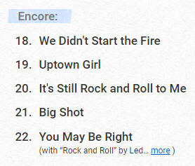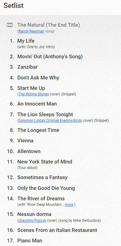 We were pretty far up there, 25 rows into the upper balcony and only a couple from the top, plus we were off to the side. The problem wasn't so much the view, as the sound was off. Billy Joel came out and immediately asked how hard it had been to get to the show, laughing that he wasn't sure he would have done that to see him. He also laughed about how cold it was, asking his brass players if their lips were sticking to their instruments. Billy is just a year younger than Stevie (they were both born in May), but seemed so much healthier and stronger voiced. He did joke a bit about singing "An Innocent Man" which requires him to hit high notes which were hard even when it came out in 1983. Despite the seats, the cold, and the challenging sound, we really enjoyed this. Both of us essentially knew the words to every song and really enjoyed both the commentary and the performance.