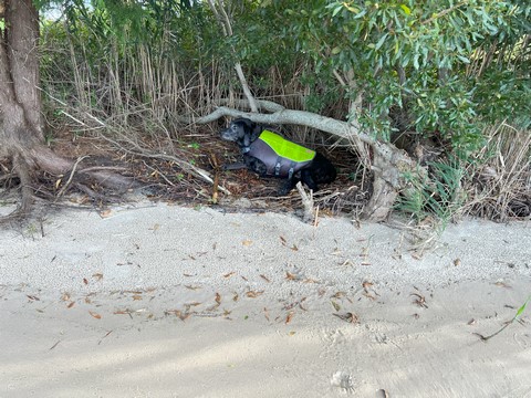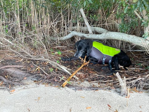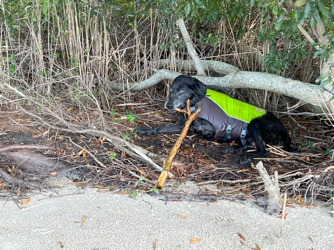 He actually took himself out of the water, bringing his stick to lie down under the tree along the water.