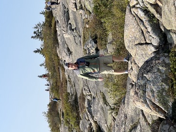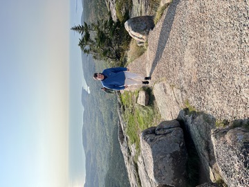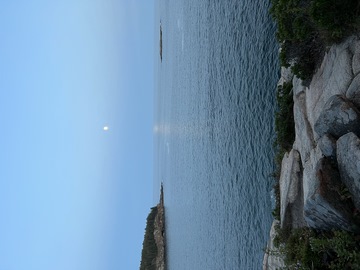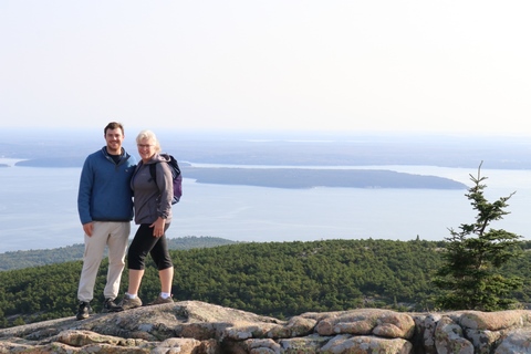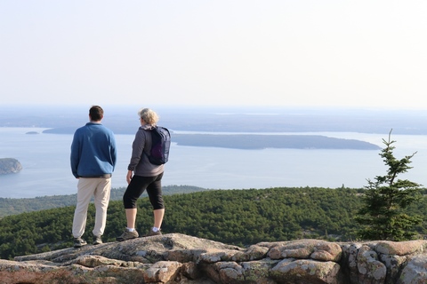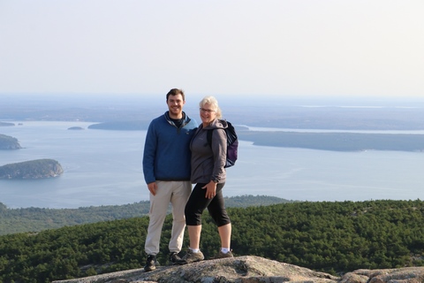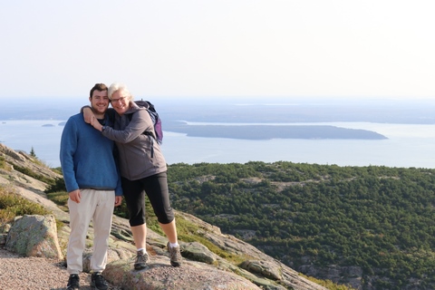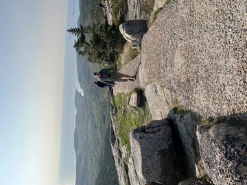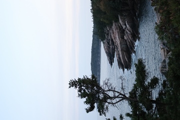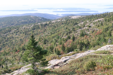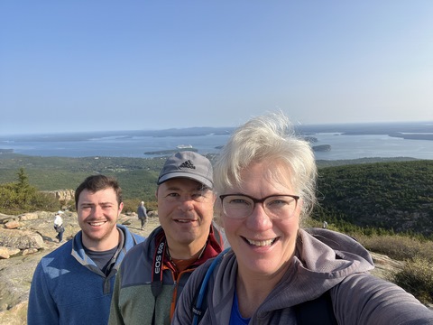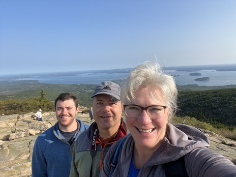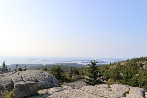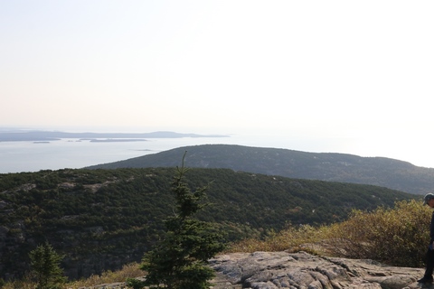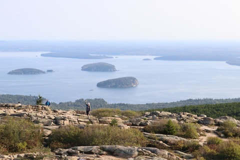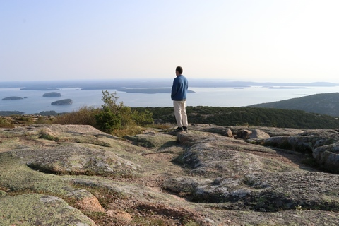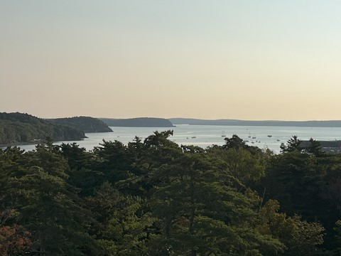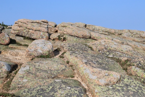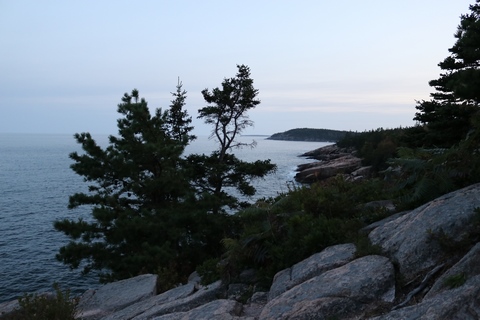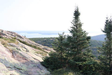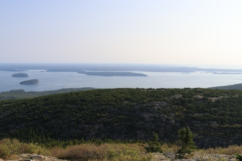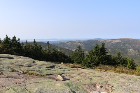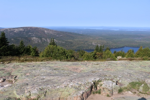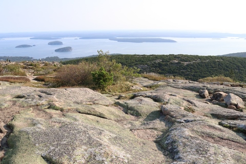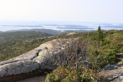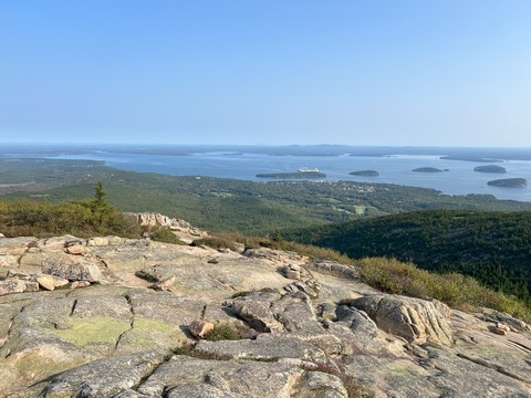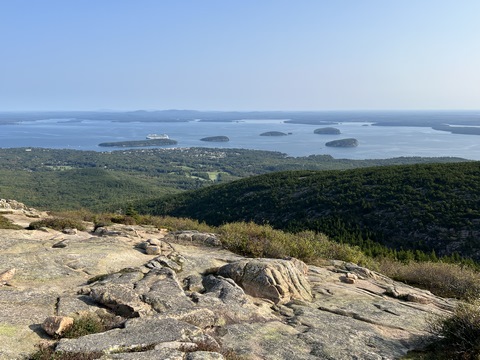 The next morning, we drove up Cadillac Mountain, which is the highest point on the eastern seaboard at 1530 ft (466m). We weren't able to get a pass to go at sunrise, despite being on the reservation site when they were released, refreshing to try, and watching all passes disappear to bots within less than a minute. Oh well. It was a bit overcast and foggy early, so not sure we missed too much. The mountain is crowned with a bald mass of Cadillac granite, which is slightly pink. It did offer a great view. The bald peaks of the area are the genesis of the name of Mount Desert Island as an early explorer thought the tops looked like there were a desert from a distance, never climbing them to find the truth.