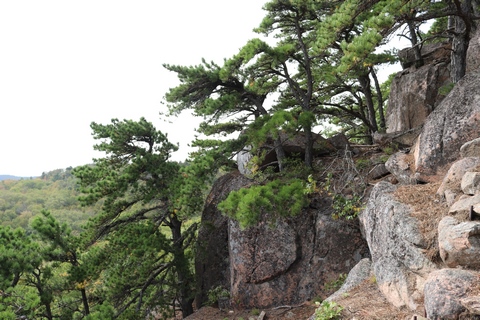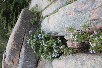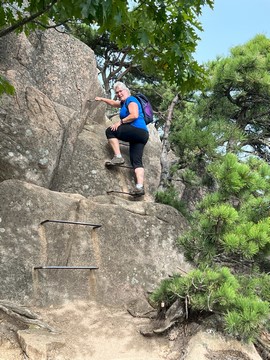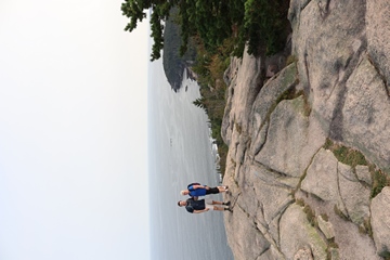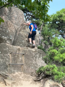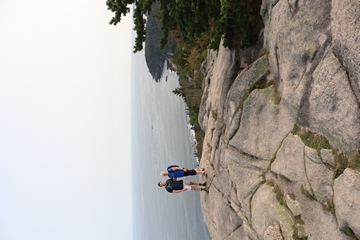 This is one of Acadia's "iron rung routes," similar to the via ferrata trails in Europe and other parks (via ferrata, Italian for “iron path,” is a protected climbing/hiking route that uses steel cable affixed to rock, metal ladder rungs and rock holds to ascend and traverse through the mountains). In Acadia, instead of trying to find the easiest way up the mountain, these ingenuous routes negotiate the steep mountain cliff contours with the aid of iron rungs, ladders, and handholds, offering hikers exhilarating exposed views. The Beehive Trail lived up to this, with several steep or exposed sections requiring use of iron rungs to help traverse.
