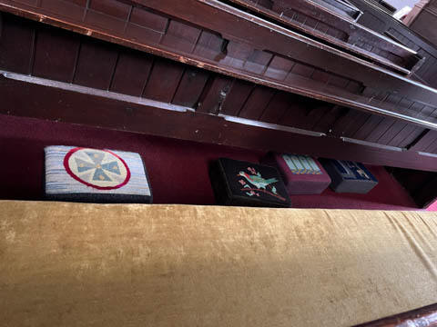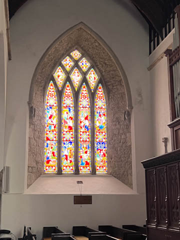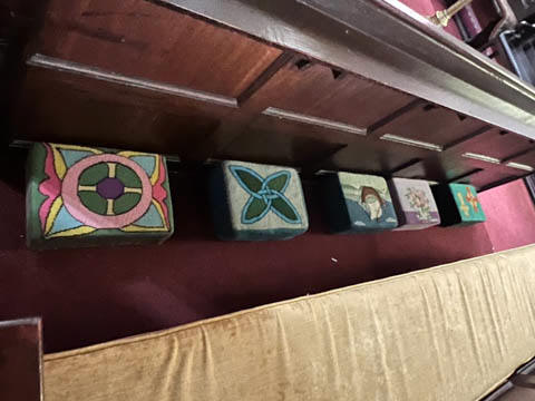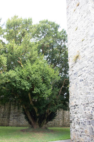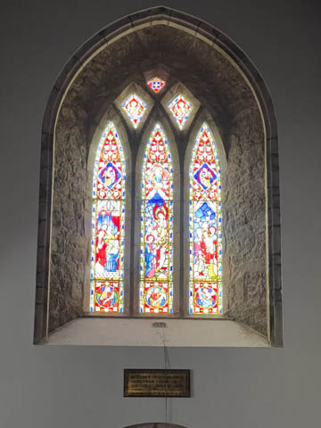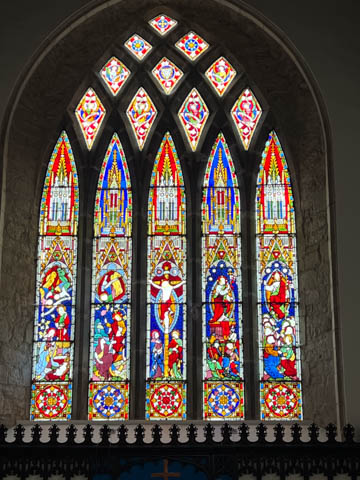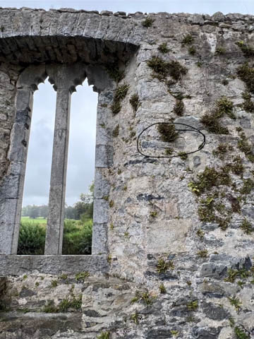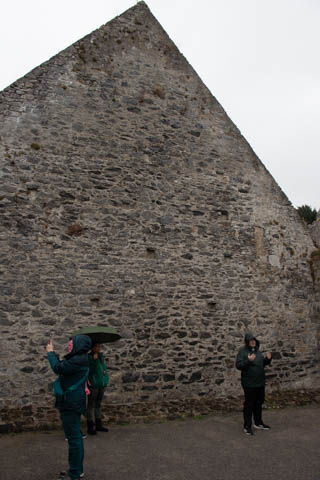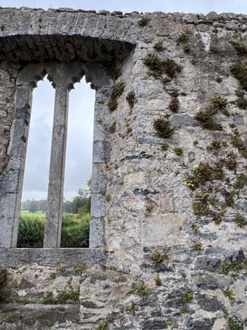 The literature and signs in the chapel told that the central tower complete with bells was added in the 15th century, about 100 years after the main part of the church was built. One of the side chapels contains a small font from the 12th or 13th century which is still occasionally used for baptisms. The wooden seats in the choir were once were the friars would gather to worship. The current seats were made in the 19th century by craftsmen from Adare Manor. Ever since the refurbishment (and stained glass windows) funded by the Earls of Dunraven in the 18th century, the seats on the right have been restricted to the Earl's family. On the wall above the altar rail is a small window (now bricked over) which leads to the infirmary, allowing friars in the infirmary to attend worship service. We were delighted to discover hand-embroidered kneeling pad along all of the pews. The handout said the current set of kneelers came from a Church of Ireland parish in Bangor, Northern Ireland. They replaced a previous collection which were ruined when the River Maigue overflowed, flooding the church in 2014.