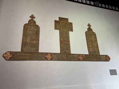 Outside the church, we could see a number of small statues and figures in the facade along the roofline. According to the handout these were "bosses" not gargoyles as they provided decoration but were not drain spouts. They "may have been added to ward off evil spirits and provide a touch of whimsy to the church." The emblems include the Tudor rose, a crowned lion, a human head, and a unicorn.
