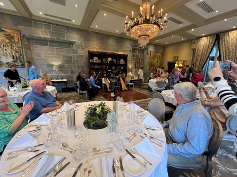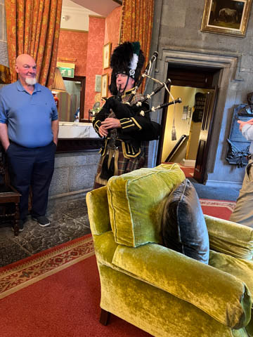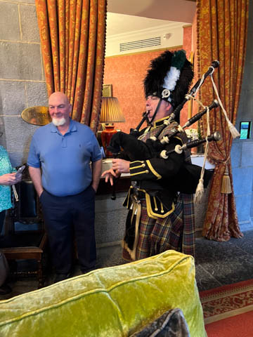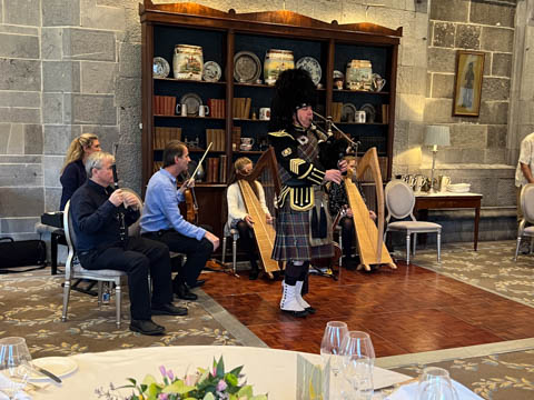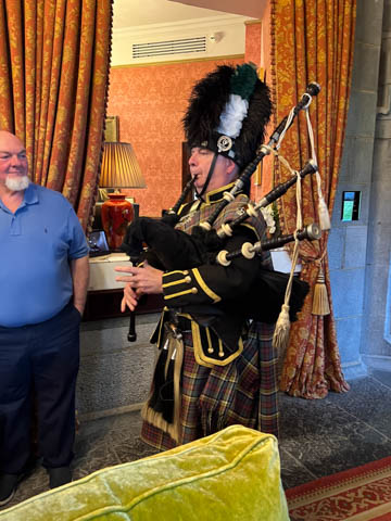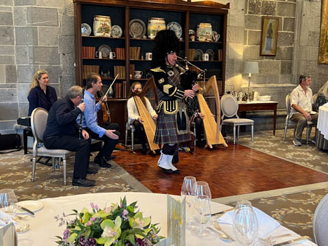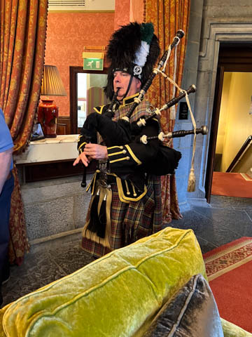 Time for dinner. We assembled in the lobby and were soon greeted by the bagpipes, who led a procession to dinner.