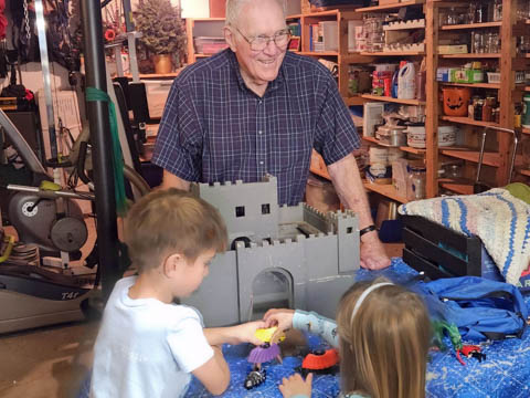 Sally came over to visit for some Tank time. Karen sent us this photo of Bill with her grandkids. Nice to have someone play with the castle again. We sent him some toy knights to ensure they come back.
