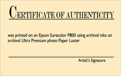 This is the Certificate of Authenticity that you receive every time you purchase one of my prints.